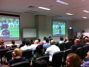 Hold your horses. Nobody do anything. It is race day…apparently the world stops turning on Melbourne Cup day, and everyone becomes gambling fools, and of course horse racing experts. Several of the ladies in the office are wearing their race hats (there is one little one in the picture below – black, towards the left, kind of hard to see). The guy that I am replacing is back on the office today, but “training will be difficult because it is Melbourne Cup day and that puts a wrench in everything”. It’s craziness! I thought I better submerge myself fully so I placed a $2 bet. My horse didn’t pay out, unfortunately, but the race was quite exciting. Afterwards there were fancy appetizers for all to enjoy.