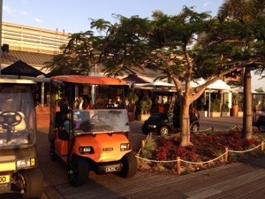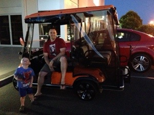 We knew we wanted to get a buggy (golf cart) because everyone cruises around the neighborhood in their buggies here. There are lots of buggy paths that take you to the golf course, the marina shops & restaurants & grocery store, and Hope Island shops & restaurants. When Jay caught wind of an orange super sport buggy with fancy wheels, he knew he would wait for it to arrive at Carts ‘N Parts. When he took it for a test drive, he was sold.