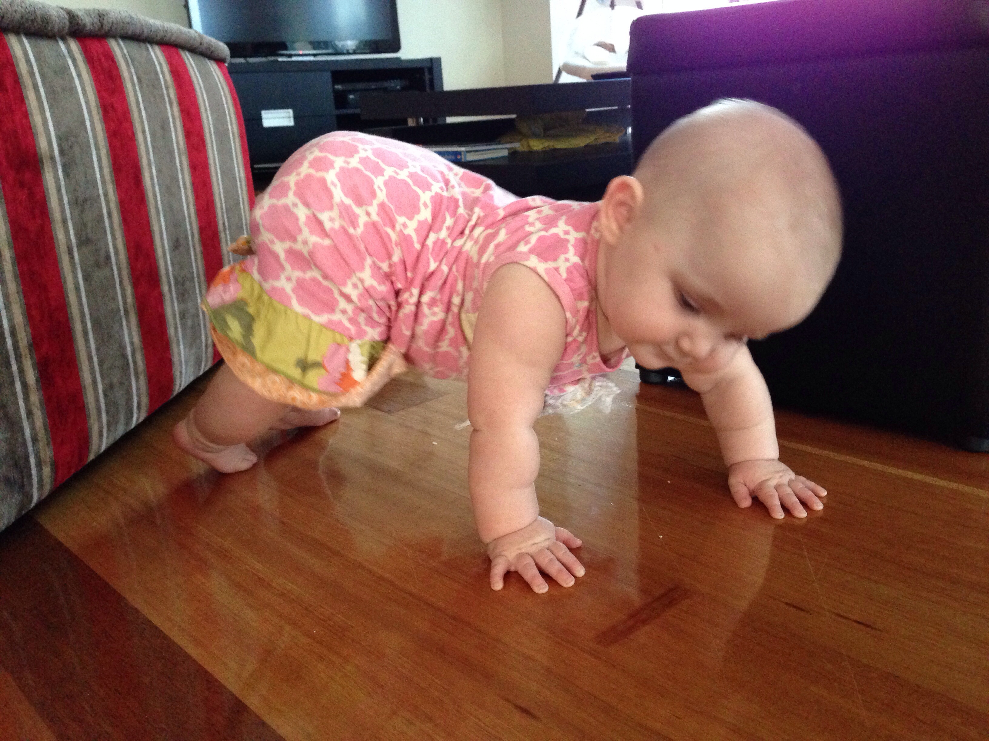 It is official. Lily looked a bit like a newborn foal trying to find her legs, but after a wobbly first try, Lily is now crawling!! Timing is perfect – Jay just went and bought a drill to I stall the baby gate this afternoon. Going to need it!
