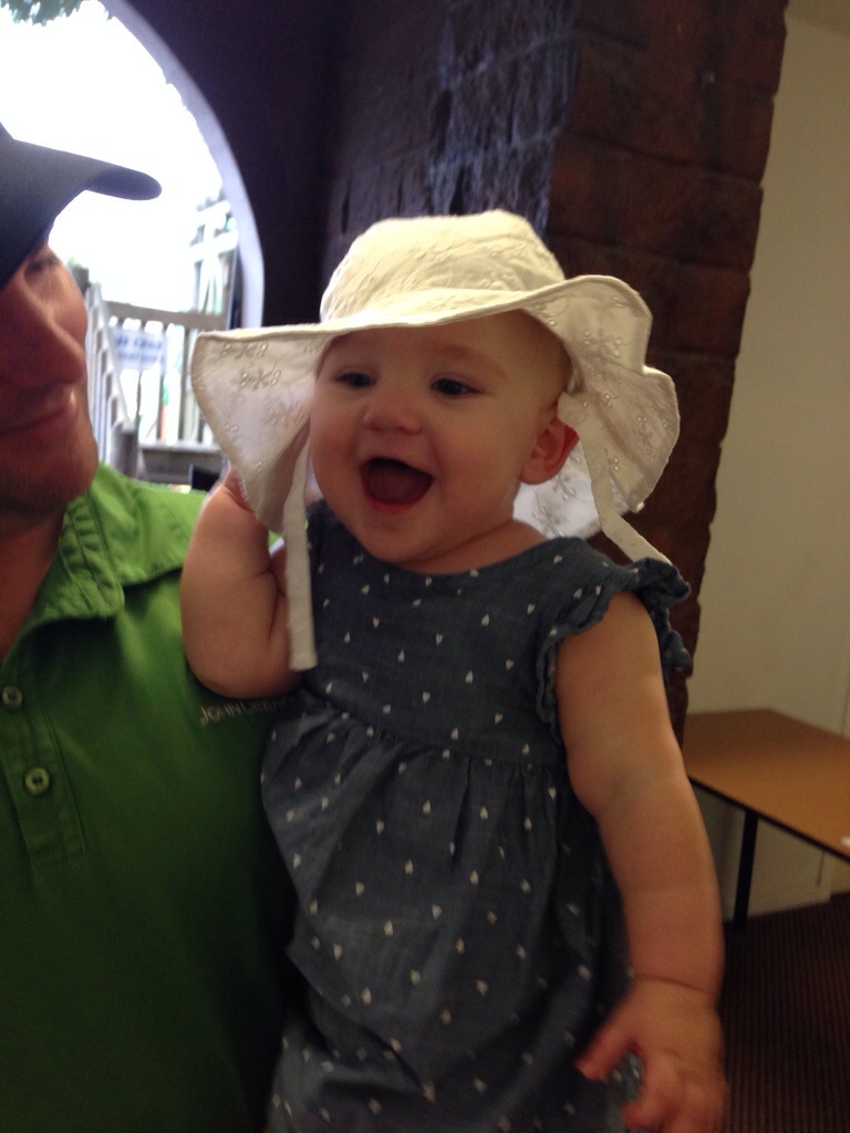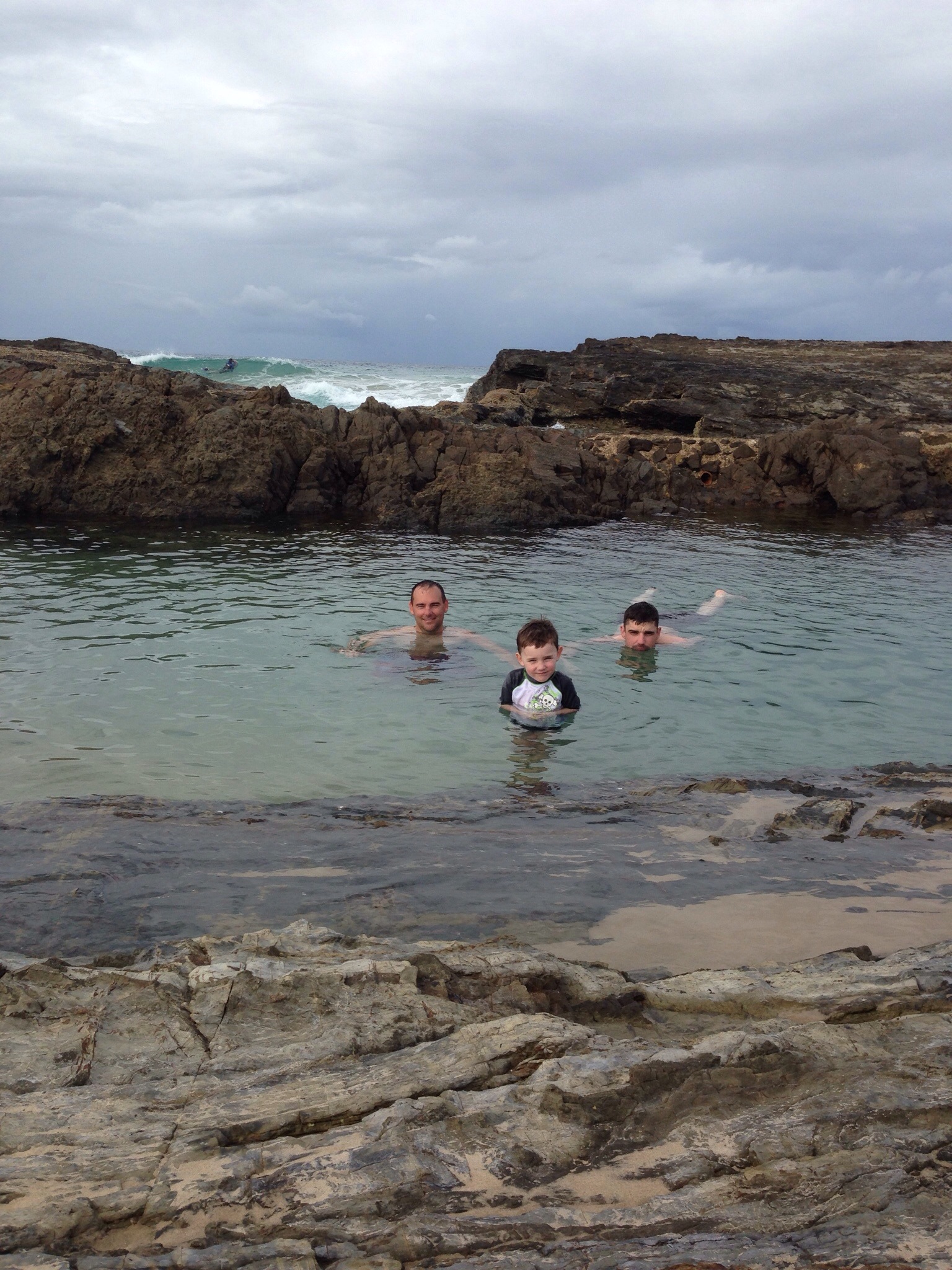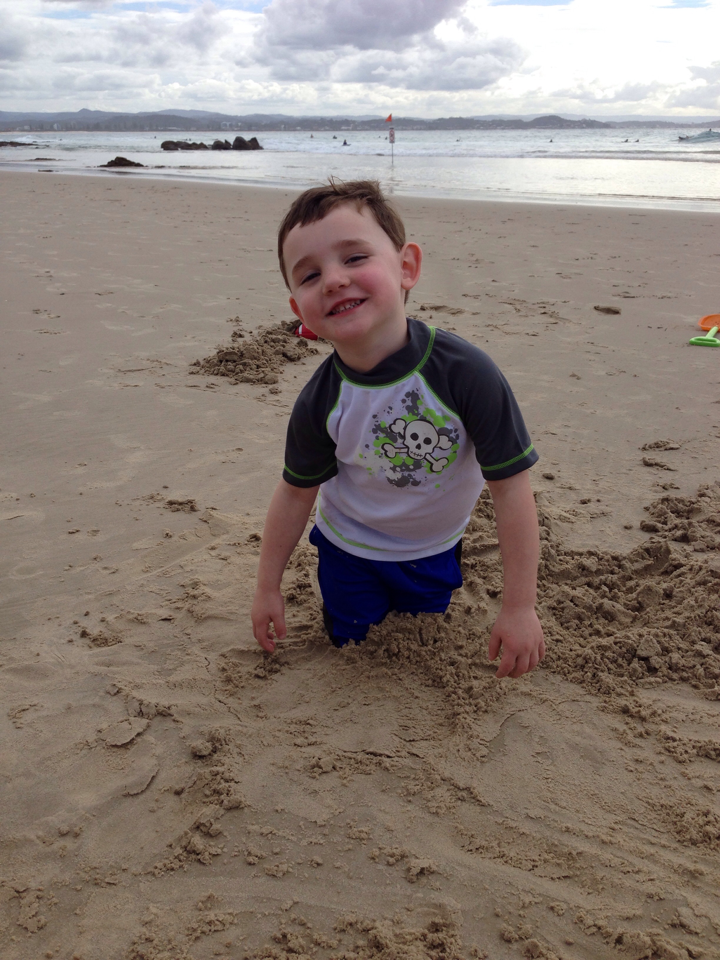 The boys went out pretty far into the ocean this time. Far enough that the waves were picking them up. They found a rock pool and Ty, who earlier in the day said he didn’t want to get wet and therefore didn’t put on board shorts, wanted to join them. He didn’t want to go in in his mesh shorts, so he kicked them off and jumped in wearing just his undies. Who brought the bogan to the beach??? He had fun, though. Lily spent most of the day crawling on the beach, only trying to sneak in a handful of sand a few times. :). Fun day!