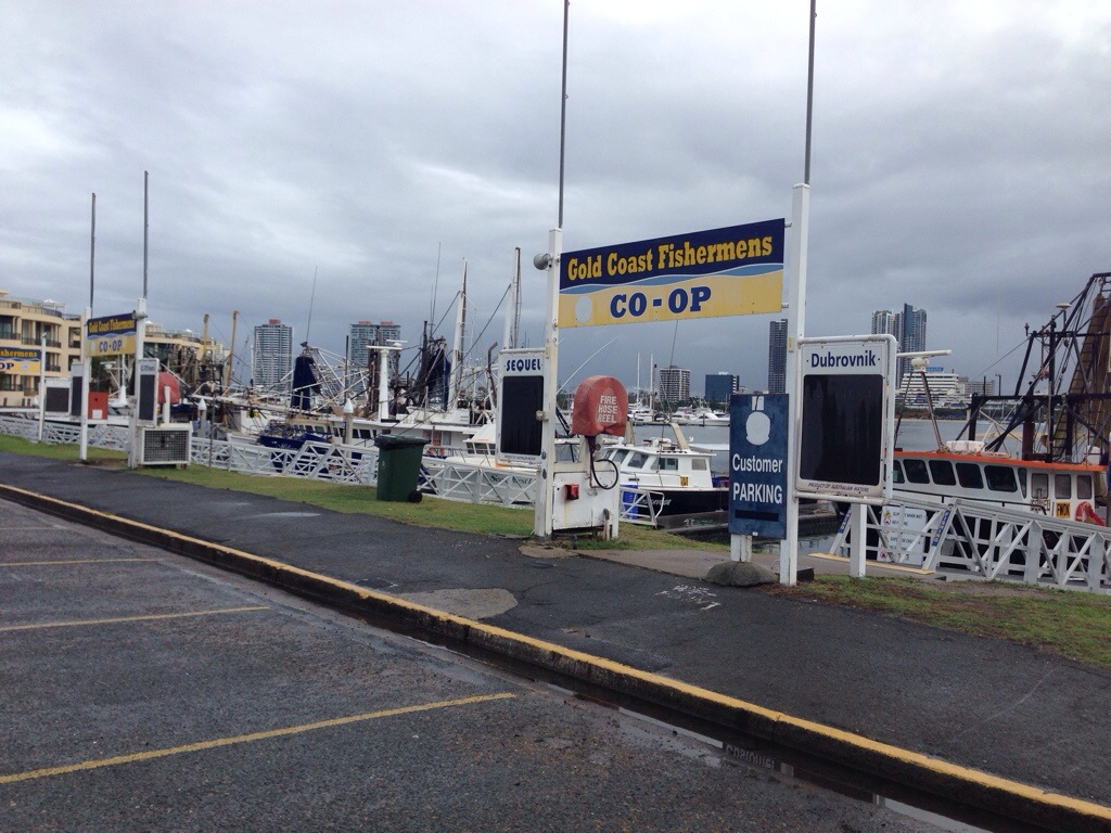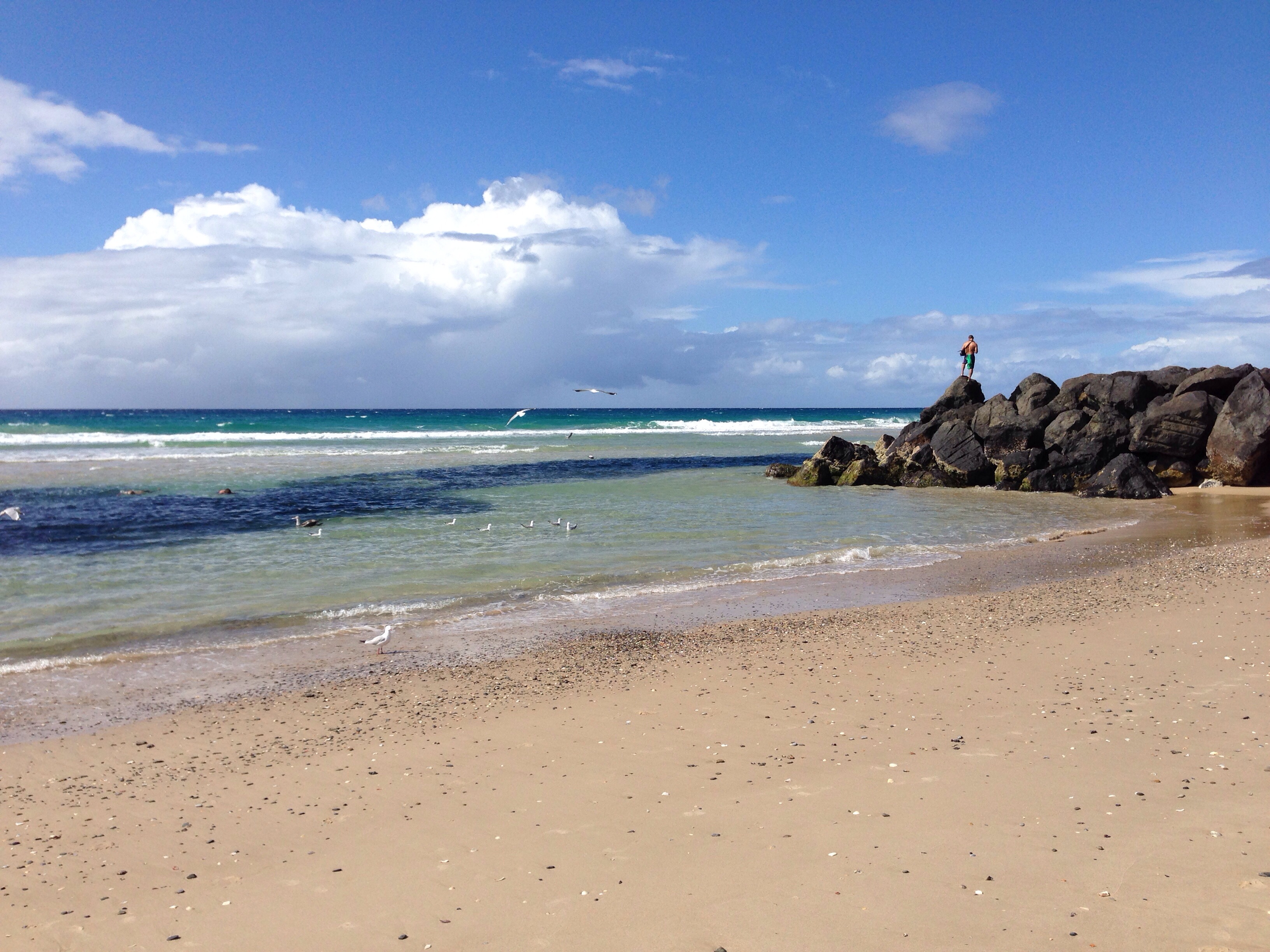 We then headed down the coast to a place called Kingscliffe Beach. We thought we might be able to snorkel, but it was too cold and didn’t look like it would be great for seeing many fish. So after letting Ty play in the playground equipment, we decided to go up to our favorite beach – Rainbow Bay. Rick wanted to stop and see the Girls from Snowy River one more time, and he also wanted to go walk out on the big rocks that break the surf. We walked into the Surf Club and the mom from Snowy River got all excited and flustered. Wasn’t long before she came over to him with 2 Snapper Rocks t-shirts. She asked him if he wanted black or white, then just gave him both. Such a charmer. Two for the price of none.