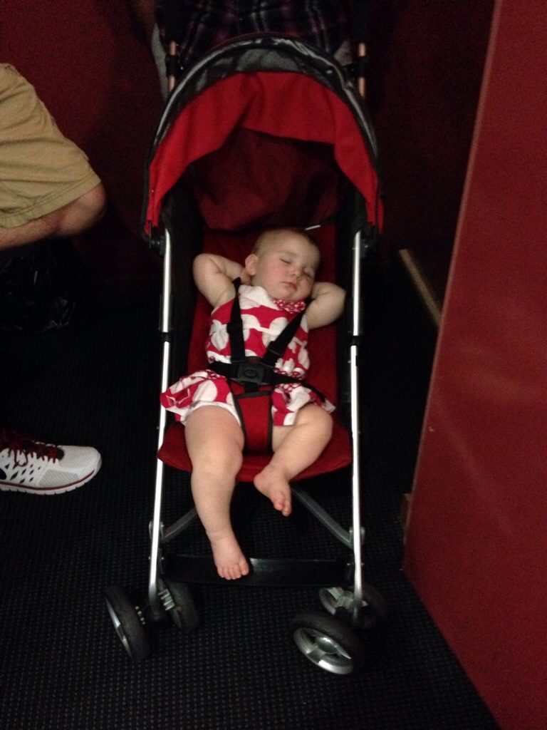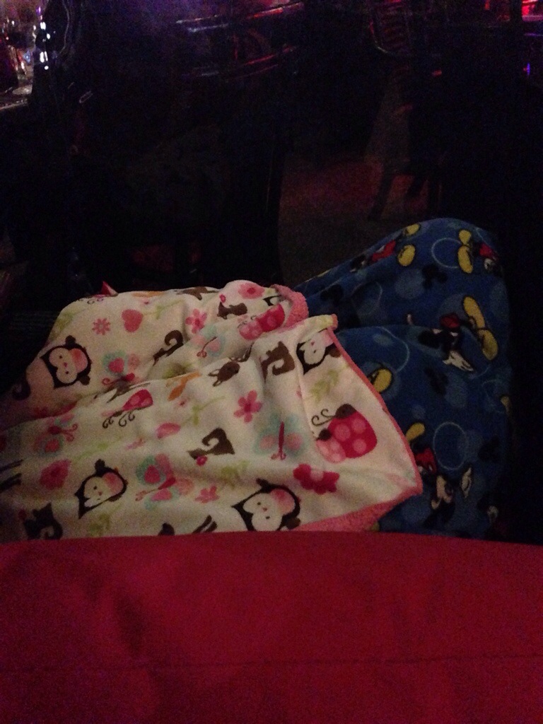 Rick had to entertain himself again on Thursday while Jay and I went to work. He trimmed our hedges, went grocery shopping, and chatted with the owner of one of the marina restaurants. The guy, John, told him to come back that night for the live music (guy and a guitar) and Rick could sing a few songs. So, when we got home we got the kids bathed and went to Red Rock for a later than normal dinner. Ty must have used up all of his energy at school that day because he wanted to lay down on the buggy ride to the marina. And he sat in his chair at the restaurant with a 10 mile stare. It wasn’t long before he was about to crash, so we pushed 2 chairs together and covered him with a blanky. He was out by 7:00 – before dinner arrived. Lily drank her bottle and fell asleep. So for the first time ever, both kids were asleep at dinner and we had a normal, uninterrupted dinner. Ty is in here somewhere…