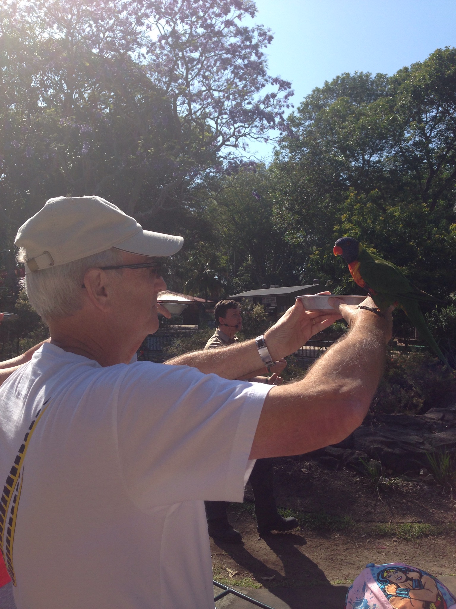 On Sunday, we got up early to feed the Lorikeets at Currumbin. Unfortunately, due to the abundance of natural food available to the lorikeets, there were only a handful that came to feed at Currumbin. It was a very calm bird feeding – nothing like the experience that I had with my brother. But one landed on Kirk and Jay, so it wasn’t a complete fail.