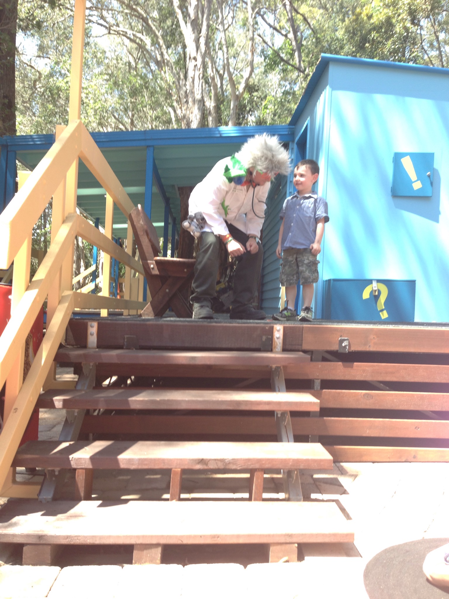 Our morning tea entertainment was Dr. Doo-Lots, a goofy guy that teaches kids fun facts about different animals. Ty volunteered to go up on the stage and he spun the wheel to learn about a lizard. He won a free drink and 2 wristbands for volunteering. 🙂