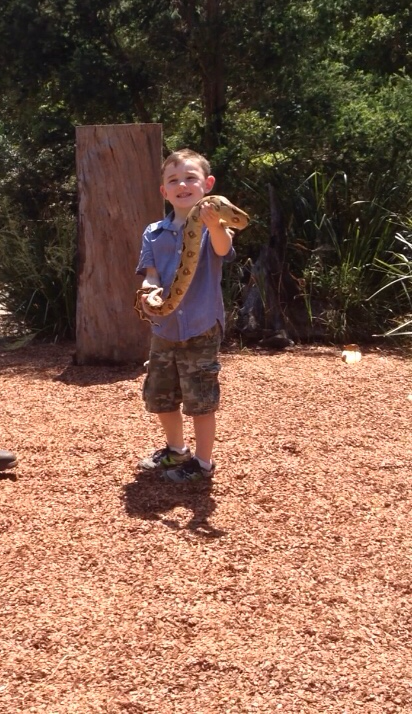 While we were waiting for the bird show to start, Ty went up and held a python. It licked him. I would have thrown that thing across the park. He just smiled.