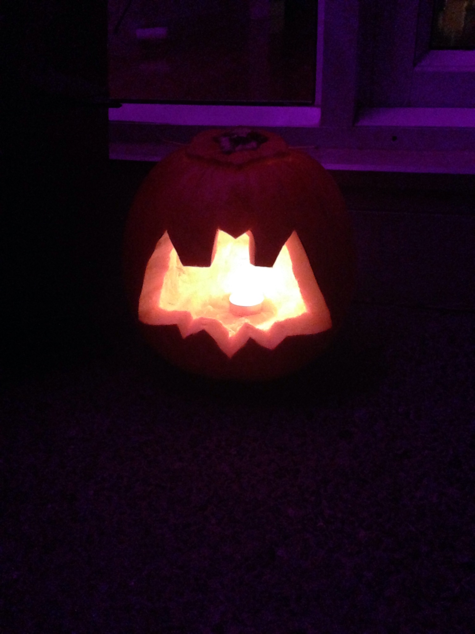 And last, but not least, we carved our jack-o-lanterns. Jay’s bat turned out pretty good after lots of practice runs on a cardboard box. I went for the simple, traditional design. The kid who had just spent all day holding all sorts of disgusting critters wouldn’t reach his hand in the pumpkin. I didn’t mind, though. :).