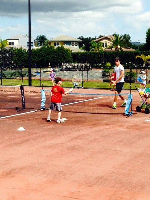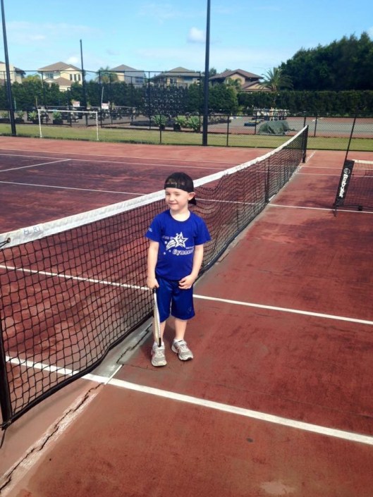 I received an email from the people that run the tennis courts in Hope Island saying that they were running a 3-day tennis camp over the school holidays. I asked Ty if he wanted to do it and he got really excited, so I signed him up on Friday night. Em and Lily got him squared away on Monday morning. When she picked him up at noon, he was smiling from ear to ear and dripping in sweat. The coach said he was a natural, and that he had done really well. He earned raffle tickets for good behavior and cashed them in at the end of the day for some candy. Day 2 he had another great day, and this time when he cashed in his raffle tickets, he chose a mini basketball and orange tape to wrap a tennis racquet handle. Hmmm, I guess that was a clever way to talk us into buying him a tennis racquet (he has been using a racquet ball racquet). The third and final day of camp, Em bought him a new racquet and signed him up for lessons twice a week when school starts back up. He loved it! He learned a lot, got some good exercise, and had a blast. Yay!