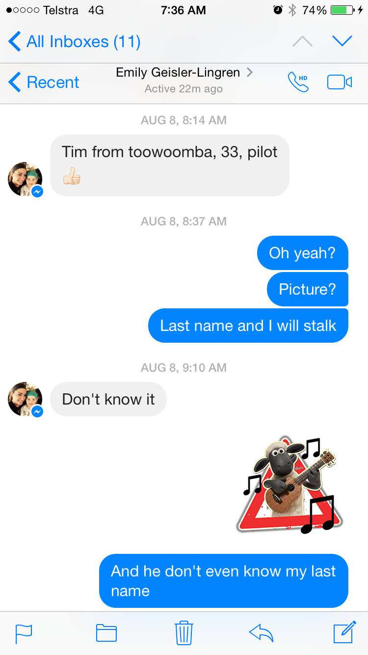 No, poor Tim from Toowoomba has no idea about this blog. Remember, he isn’t on Facebook, and she has not previously told him about the blog. Give her another month and she might cave. Serves him right for not being on Facebook (I hold a bit of a grudge because I can’t do any research on him).