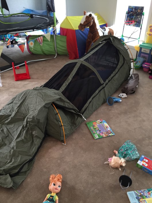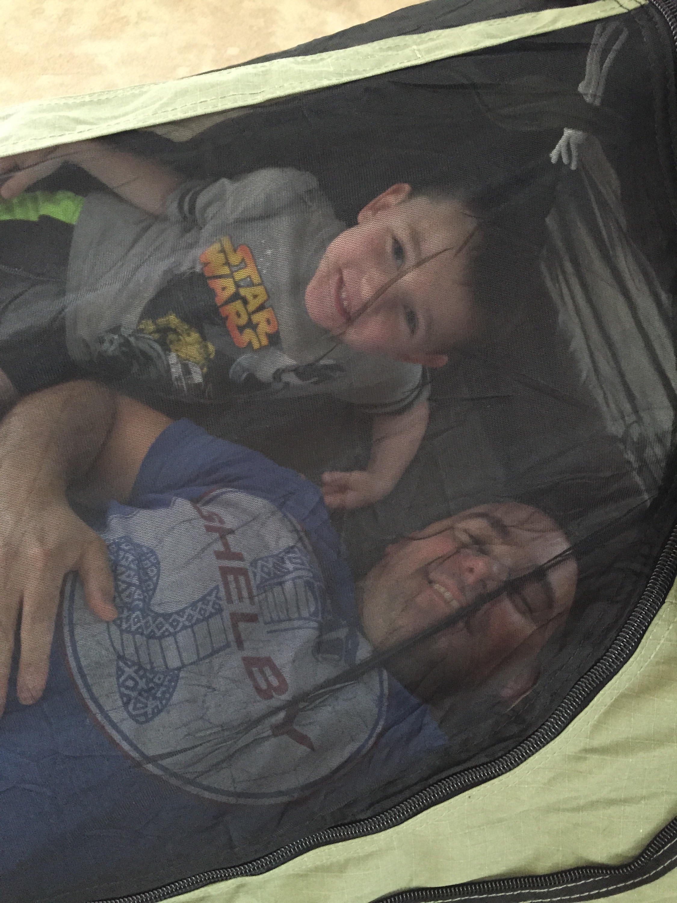 What the heck is a swag, you ask? It is a coffin-like tent for one or 2 people, perfect for camping or sleeping in horse barns. Em has slept in a friend’s swag when she has helped out at horse shows, and raved about how awesome they were. Jay and I have been keeping an eye out for one to give to Em as a thank you gift for everything (and more) she does for us. Jay happened to be out shopping and got an email from the local camping store saying swags were 20% off. Perfect. The look on Em’s face when Jay carried it inside was priceless. She forgot to take it with her to a horse show this weekend, but we couldn’t resist setting it up to check it out. Ty insisted on sleeping in it most of the night. Nice swag!