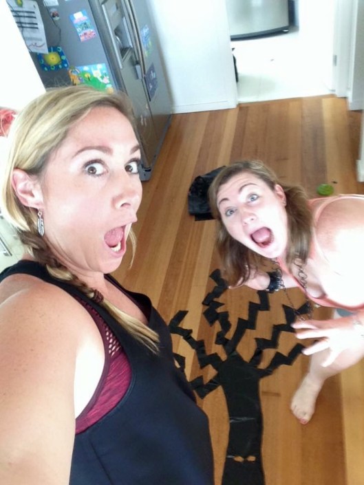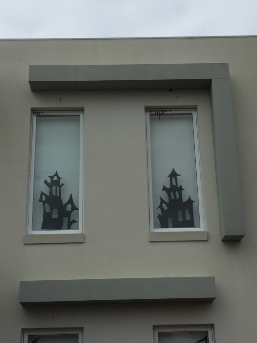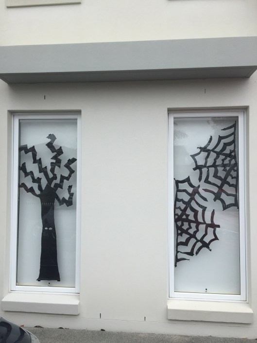 Emily has gone and pretty much invited everyone she knows over to the house after trick or treating next weekend for a little Halloween party. I was stressing about this at first because I haven’t ever tried to throw a Halloweeny party without Ashely and Rachel before, nor do I have any of my Halloween decorations with me here, so I basically panicked. And then Jay assured me it doesn’t have to be a full blown Halloweeny – in fact he gave me a budget of $0 to spend on decorations. So Em and I had to get creative… We discovered the beauty (and cheapness) of trash bag Halloween art. I don’t want to ruin it for anyone that comes by to see it dirt hand, but here is a little taste of what we have turned our home into after a day of hard core crafting. We are pretty proud of what we created with 5 trash bags!