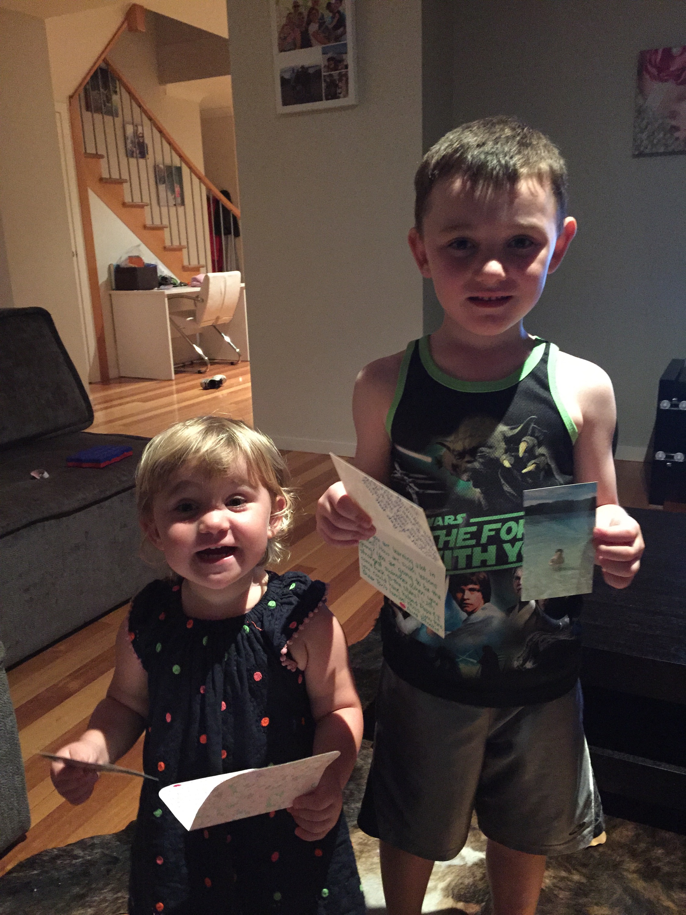 That is Lily-speak for mail. She loves going to the mailbox to see if there is anything new. The kids each got a letter and a picture from Aunt Brookie in the mail. Lily carried hers around for days.