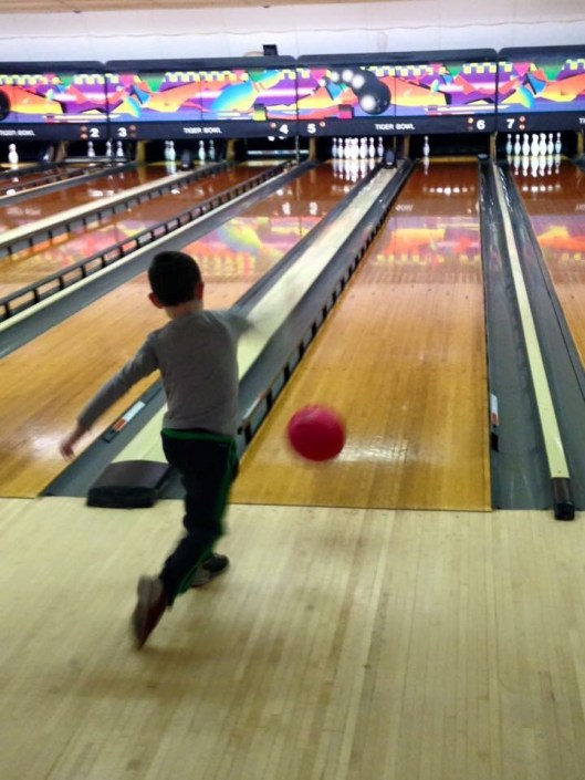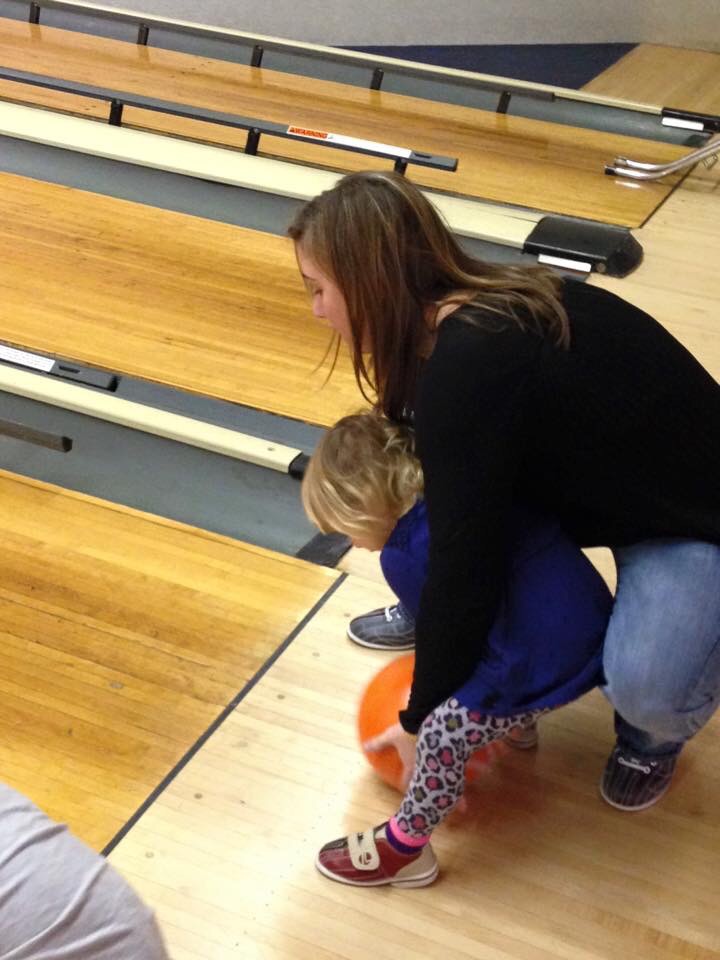 Jay went to the Iowa Wild hockey game with some work mates, so Em and I were trying to think of something fun to do with the kids. We rounded up a bunch of people and went bowling in Madrid. Nana, Papa, Jess, Jason, Bri, Jessi, Mark, and Ray all showed off their mad bowling skills. The boys dominated, Jason was not a surprise, but Papa, Mark and Ray shocked us all. Very unique form, but those boys knocked down some pins! Bri is a brute on the alley, throwing some fast balls down the lane. Jessi wins the award for the only person that scored two zeros in one set. I am going to blame my poor performance on not having my own bowling ball and shoes with me (I used to date a guy in a bowling league – be jealous). Lily had a great time rolling the ball down the “slide” and knocking down the pins. “I did it!!” I am a little concerned that she told Auntie Em “I no good at this game.” She may have gotten her perfectionism from her mama. And Ty…his arm might hurt from all of the effort. He did so well!! Greasy food, cold-ish beer, strikes, gutter balls, and laughter. Perfect Friday night.