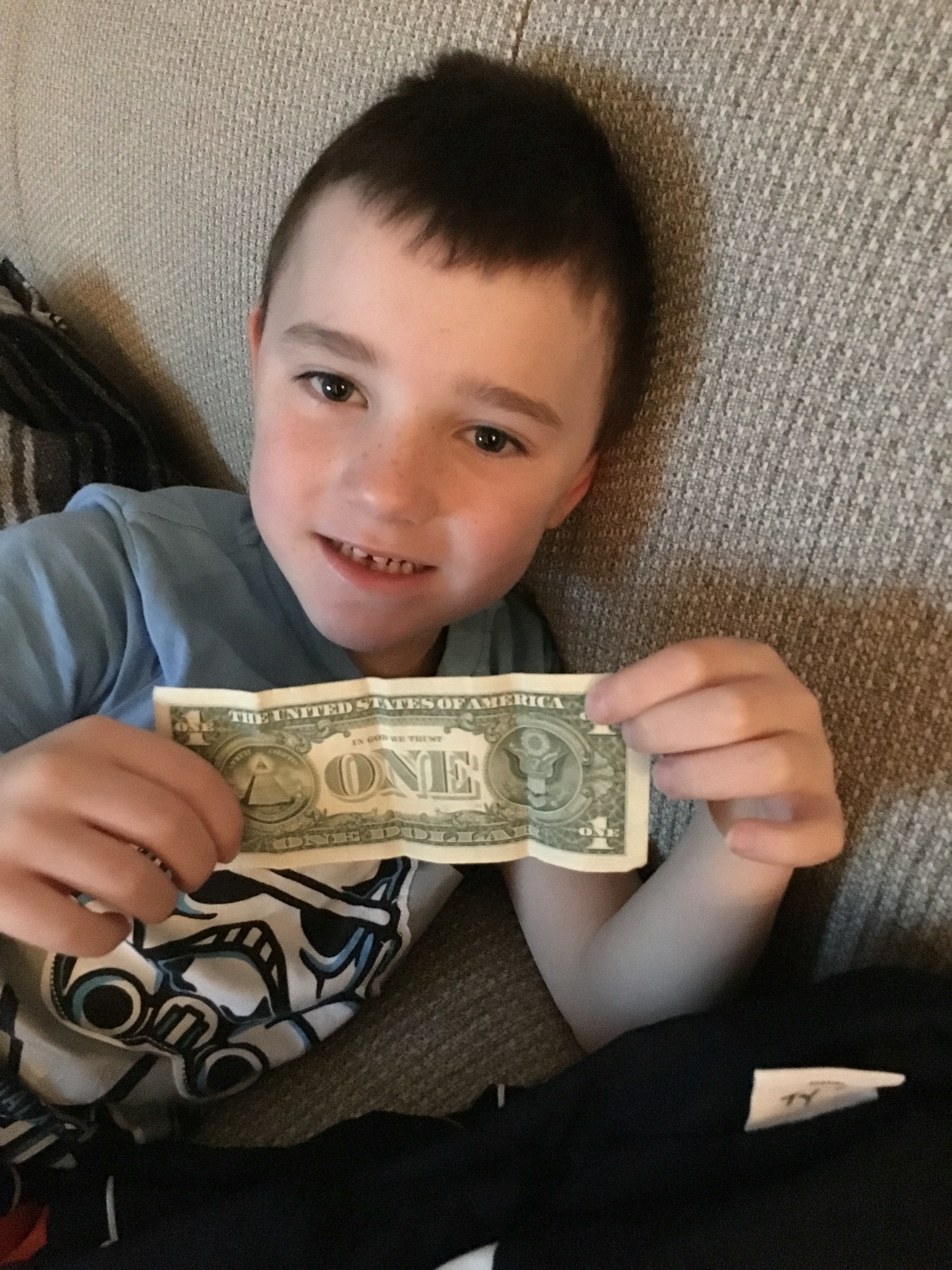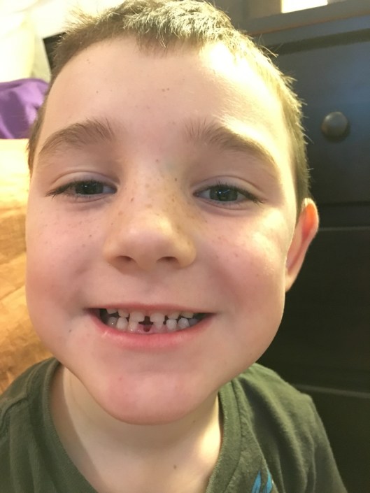 Ty lost his first tooth! His lower front tooth has been loose for a while. One morning I was in the bathroom getting ready for work and he shouted, “Mom!! I think I just lost my tooth!!” I ran over and sure enough, it was no longer in his mouth. I asked him where it was, and he wasn’t sure. We looked all over the carpet and I asked him if he swallowed it. He wasn’t certain, but he thought maybe he did. We came up with a plan – we would just write the tooth fairy a letter so she would know that he had lost it. It worked!!