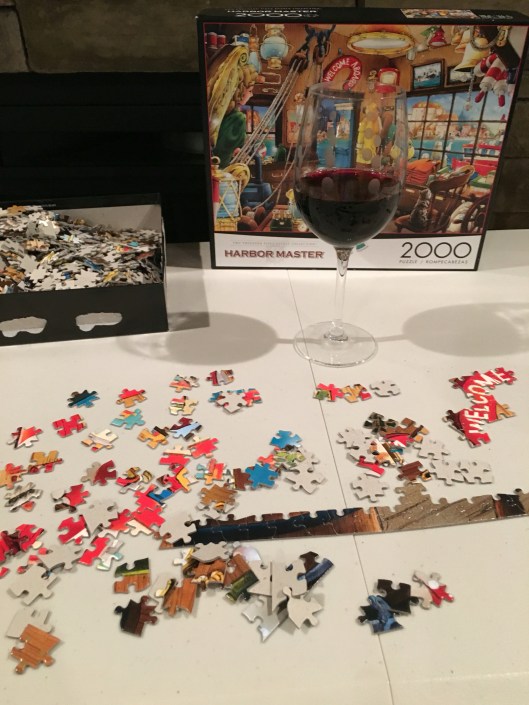 Meanwhile, back at the holiday house, we realized the 2,000 piece puzzle doesn’t fit on our table. So we bought a big board to put it on. This puzzle highlighted some of my flaws. An unfinished puzzle is a mess that shouldn’t be a mess. Everything has its place, it just needs to be put where it belongs. My OCD tendencies could not just let it go. If I was home, I was working on the puzzle. May have fallen into the “bad mom” category as I was nose down in the puzzle…