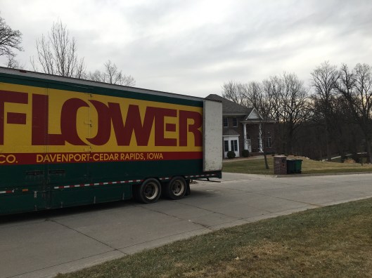 I got a call from our Davenport realtor – apparently nobody realized that the date that the buyers had put on the offer (Monday, Feb 15), was a public holiday (Presidents Day), so the attorney’s office was closed. They decided to just go ahead and reschedule for the Friday before. Did that cause a problem? Well, yes…the movers were planning on being at the house Tuesday-Friday. We were able to reschedule the movers to come Mon-Thur instead. Kirk, Sherry and I went to Davenport on Super Bowl Sunday to get things ready and be at the house while the movers were there. We really lucked out on the weather as there was no snow on the ground and it was unseasonably warm. We were able to get everything out from underneath the porch and backyard to make it easy on the movers. Mr. Paul knocked on the door and told me the new owner was at his house getting mail and was going to stop over. I was already a bit emotional about having to pack up my house, but then this sweet lady comes over and tells me that Ty’s bedroom mural is going to remain exactly the same except the sign that says, “Ty’s fishing hole” was going to change to “Brooke’s fishing hole” and they are adding curls to the little boy’s hair. And I started crying. I couldn’t hold it in. We chatted about the house, and I told her how much we had loved it. She and her husband couldn’t wait to move in. Gave me a bit of closure knowing it is going to a good family.