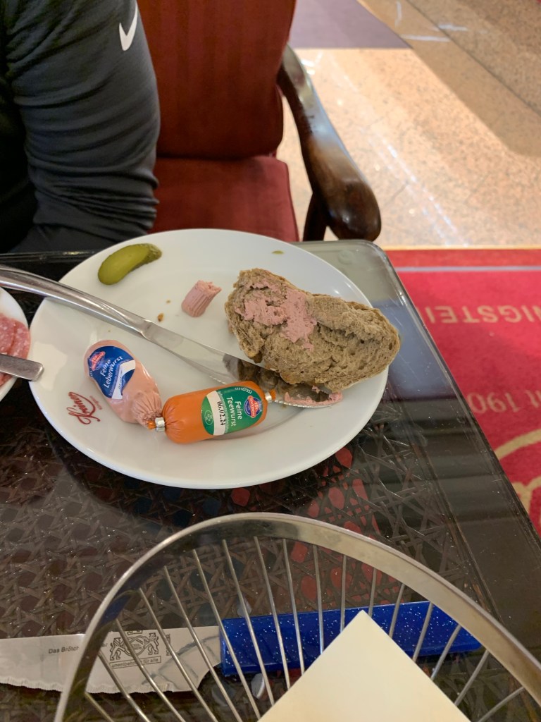 There is a delicious cake shop down the street from our house, Cafe Kreiner. We decided to stop and see what they had for a lunch menu. Lily ordered a Sausage Plate and a water (Wasser). Jay got 2 frankfurters on a roll. I ordered goulash soup and a sausage roll. Jay’s frankfurters were a success. Everything else was #fail. We forgot to ask for Still Water, so the carbonated water got Lily off to a bad start. I was expecting there to be noodles in the goulash soup, there was not, and it was not good. The sausage roll did not taste like Australia. Lily didn’t like the cheese, slices of some type of salami, and these weird little sausage-shaped packs of “meat”. After trying for 5 minutes to open them, and without first doing Google translate on the package, bless her heart she tried the meat paste on a roll. Somehow she didn’t puke all over the table. But she did ask to walk home right after. When she left Jay and I translated it. Freaking LIVER!!!!!