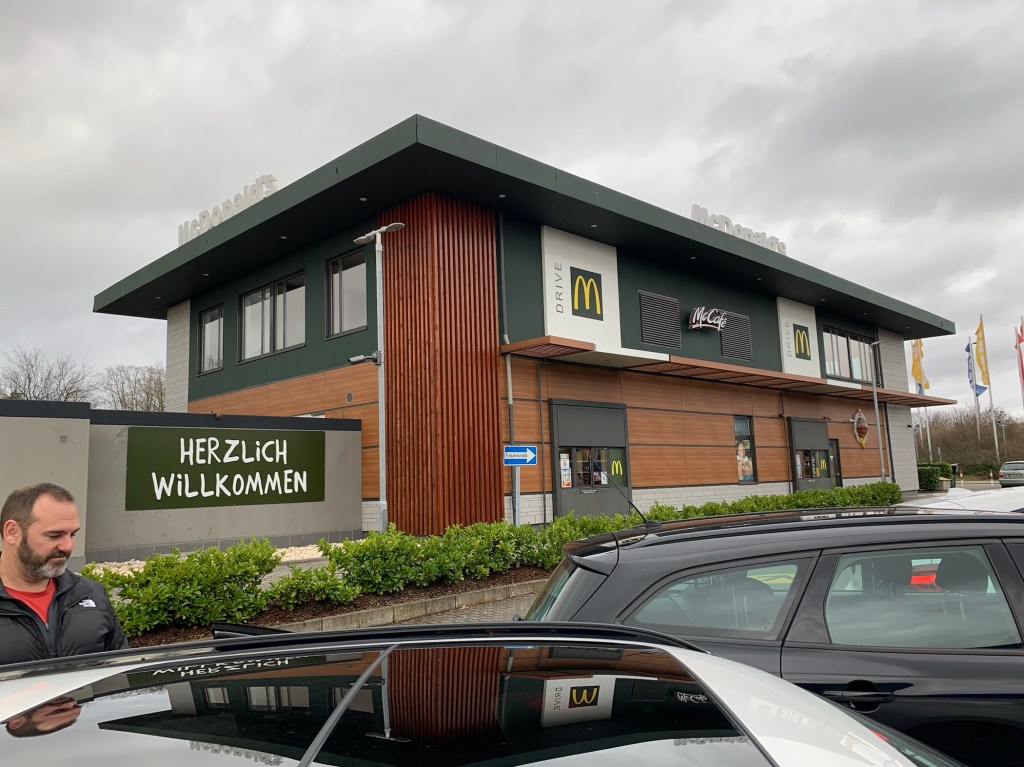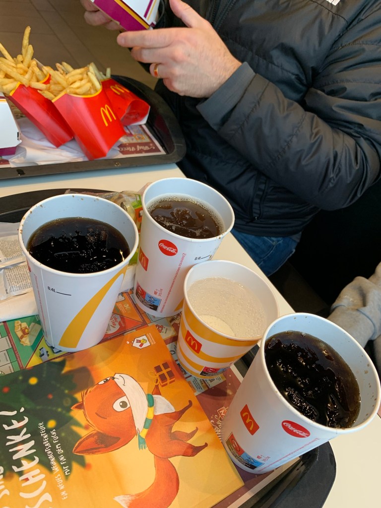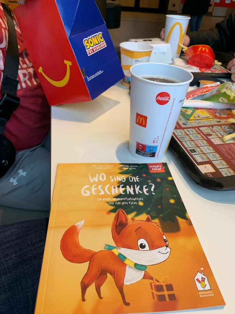 We went for a little drive to show the kids some places that will become the center of their worlds. First we drove by Lily’s friend, Maggie’s house, which is less than 10 minutes away. Then we drove to the school – Frankfurt International School – Wiesbaden (FIS-W) Campus. We drove by a potential CrossFit gym. Next stop were the baseball and softball fields. At this point the kids were STARVING. Have I mentioned that nothing is open on Sundays and holidays? Today was a holiday, but the American Gods were shining upon us and McDonalds was OPEN!!!! A couple observations. No lids. Paper straws were not automatically provided. The burger was huge. The small fry was actually pretty close to American size – unnecessarily large. The Happy Meal had an option to select a book and a donation, which we chose. The children’s book is in German and despite 104 days of DuoLingo I couldn’t read much of it. I suggested that our family goal should be to be able to read the McDonalds children’s book before we move back to Iowa.