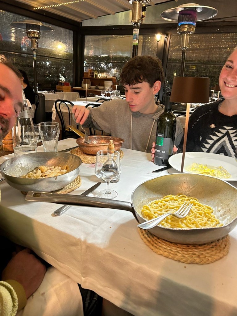 We grabbed a taxi to take us to dinner at Taverna Trilussa. We sat outside under a covered patio and listened to the rain hitting the metal roof. It was cozy and relaxing. We warned the kids that it might be a 3 hour meal and they were so patient. It ended up being less than 2 hours, but we all ate some delicious Italian food served in a skillet. 3.75 Thumbs Up for the Shearer vote. It would have gotten 4 if Lily’s pasta didn’t have quite so much pepper.