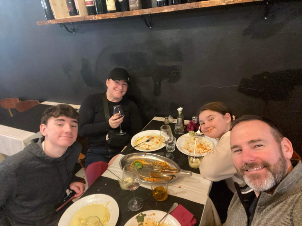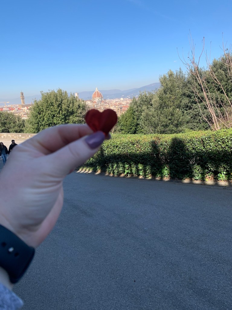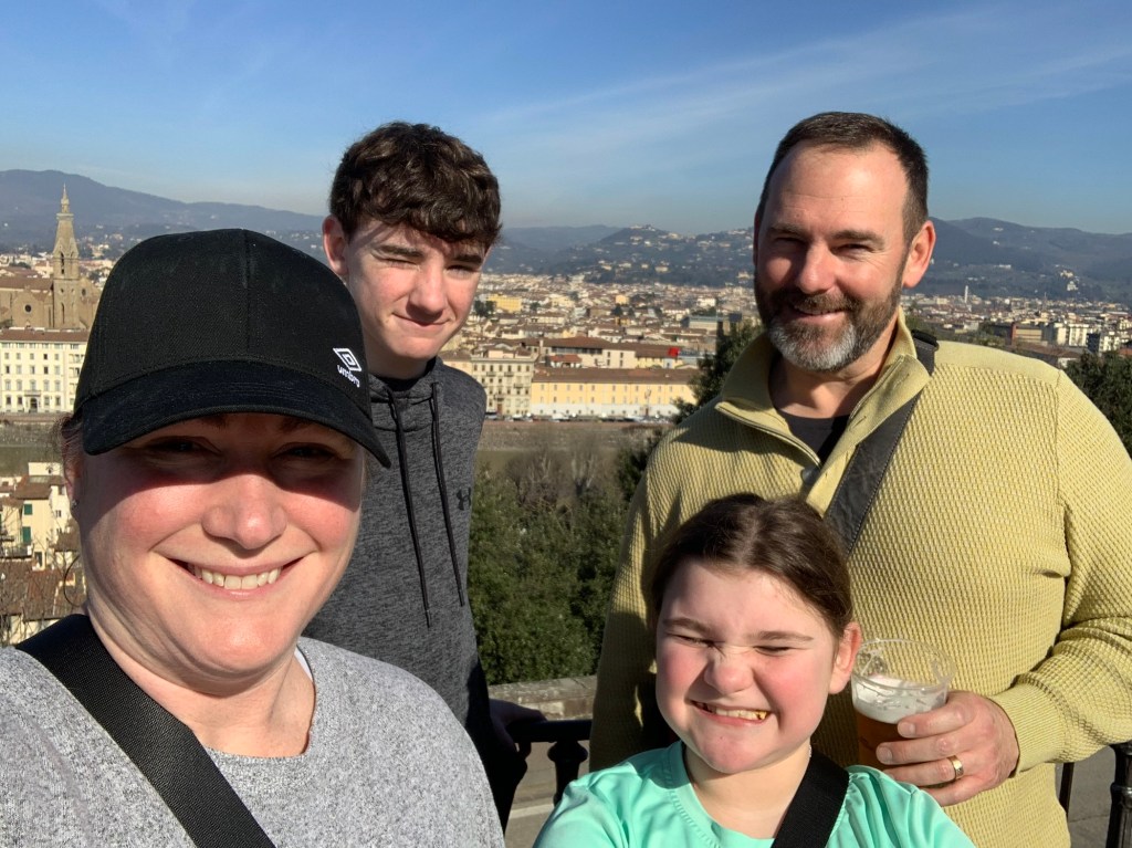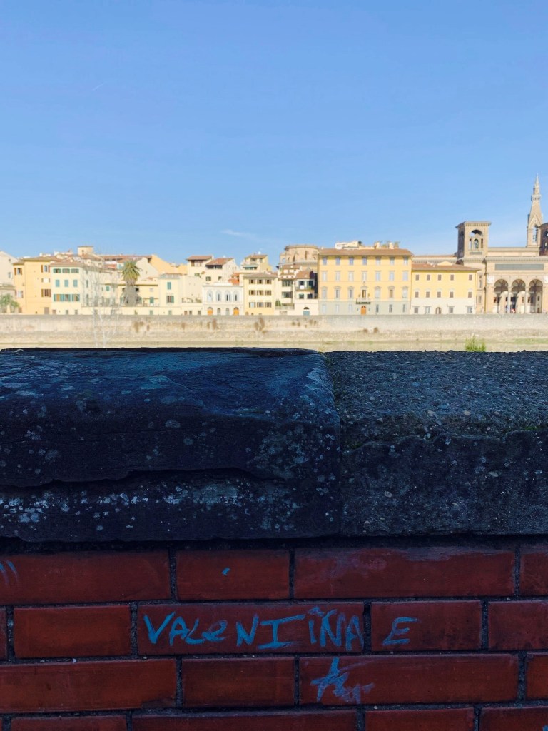 Lily had a “little” crepe for breakfast. Miraculously it did not all end up on her shirt.Michelangelo’s sculpture of David is in an unassuming building. I would have walked right past the museum if my phone hadn’t told me we had arrived. I knew the sculpture was large. But gosh, it was huge. Ok, so yes, there obviously a naked man in this picture. But once you get past that fact, the details on the rest of the body are incredible. Some of David’s proportions were purposefully larger than reality. Extra long arms and a massive right hand. Look at the veins, the knuckles. It took Michelangelo 4 years (1501-1504) to carve it out of a SINGLE piece of marble.Christmas card photo? lol We hiked to Piazelle Michelangelo to take in the views of Florence. Stunning.Right after we took this very bright family selfie, a nice young man asked me if I would take a picture for him. I took his phone and it had a message that said “Please video this for me, I am going to propose.” He asked, she said yes, and I felt happy to be a part of that moment for them. On the walk down the hill, we were talking about the proposal and I realized that it is Valentines Day. Then I looked down and saw a bunch of heart shaped glitter.Love is in the airNormally I frown at graffiti, but I was glad this one caught my eye. Valentina in Florence.We walked over that bridge to cross the Arno River – Ponte Vecchio, the oldest bridge in Florence – on our way up to the Piazzele. It is full of shops that hang off the side of the bridge. It was originally used by blacksmiths, butchers, and tanners until the Medici family arrived and turned into a market for goldsmiths and artists to stop the pollution of the river below. This bridge was the only one that survived WWII, as well as a major flood in 1966 that cleared the shops’ inventory but the structure remained in tact.Jay had what he described as “the world’s best ham and cheese” for lunch at Menchetti. Lily had meatballs (hold the side of spinach). Ty and I had pizza. Shearer Party of 4 gives it 4 Thumbs Up.