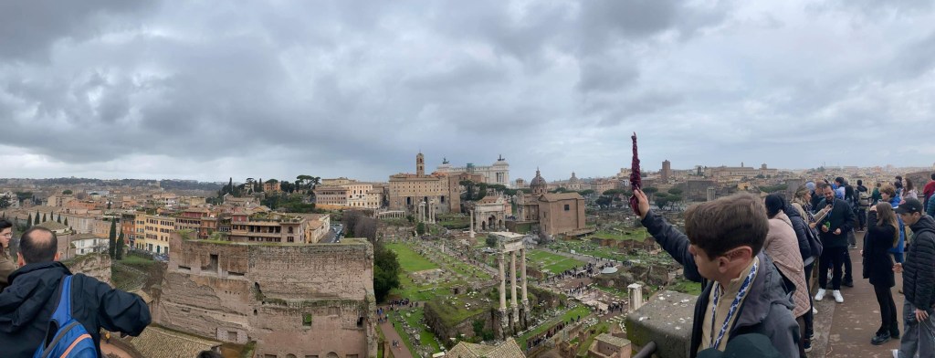 The Emperor’s private colosseum This is where the Emperor’s throne was – seated behind a curtain, where he “welcomed” guests to a 40 course meal. That was not a typo. The Emperor’s view of his kingdom – The Roman Forum – which was the center of everyday life for centuries. It was basically buried and built over top of until it was “rediscovered” in 1803. Excavation to see what is shown in this picture took over 100 years.It rained on us. A lot. It wasn’t supposed to rain, so Lily didn’t bring a rain coat. Ty is a teenage boy that refuses to wear a jacket. Picking my battles. We didn’t get a picture or video, but at 12:00 exactly, a cannon is fired to tell the churches that it is time to ring the bells. We could see the explosion and smoke, a second later we heard the noise, and then we were surrounded by 900 church bells ringing.