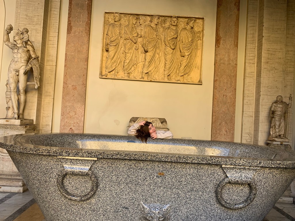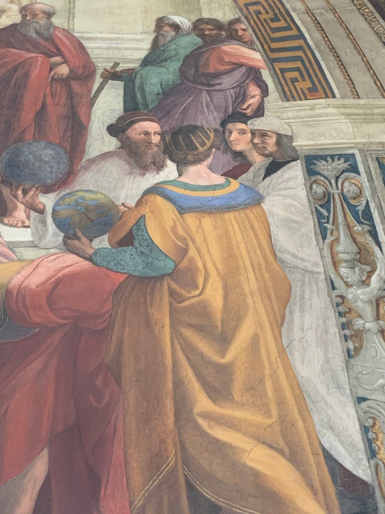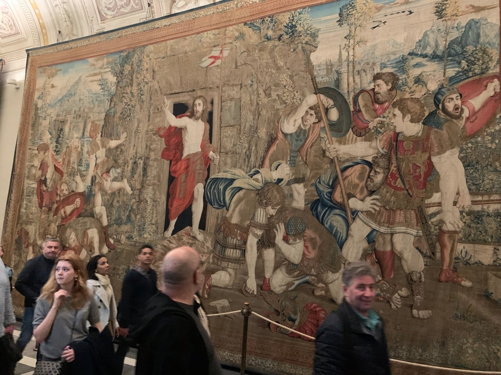 Er-mer-gerd breakfast was magnifico!!Let’s go to the Vatican todayThe unassuming building that I am pointing at is the Sistine Chapel.St Peter’s Basilica is behind us. Looks big, but not massive. To be continued….Vatican GardensI told Jay that I think my coffin should be as fancy as this oneA bathtub fit for a queenLet’s go inside the museum.Inside the Vatican Museum. For centuries this building and the artwork inside was only for the enjoyment of the Pope. In 1972 it was opened to the public. Everywhere you look, and everywhere you step, is a work of art.A papal coat of arms. On the floor.The Gallery of TapestriesThis is a tapestry called The Resurrection of Christ. While walking down the hallway, Jesus’s eyes follow you. The entire time we were walking through the museum there were giant crowds of people. But the moment we stepped into the corridor where this piece was hanging, we were literally the only people there. I had a bit of a moment. If I had to choose my favorite piece of art today, this would be it.I mean, seriously. The ceiling in the Map Room was incredible.Pope Julius II hired Raphael to paint his living quarters in 1508. A.Maz.Ing. He included many famous people at the time, and each wall represented something different but important for the Pope to keep in mind. One wall, above, was all about religion. Another wall was about math, science, literature, astronomy, etc. And another wall was about music and the arts.Ceiling painted by RaphaelA self portrait of Raphael is tucked in the corner. He is wearing the black beret.