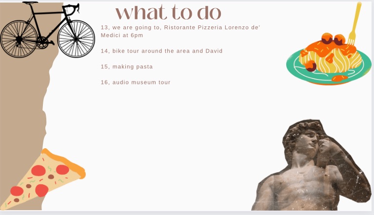 We are following Lily’s Florence itinerary that she planned out on Canva (with a couple tweaks). Unfortunately kids cannot do an e-bike tour so we had to cross that off the list. And we likely won’t go to the Uffizi gallery. But I love that she put time and creativity into planning things to do in Florence.