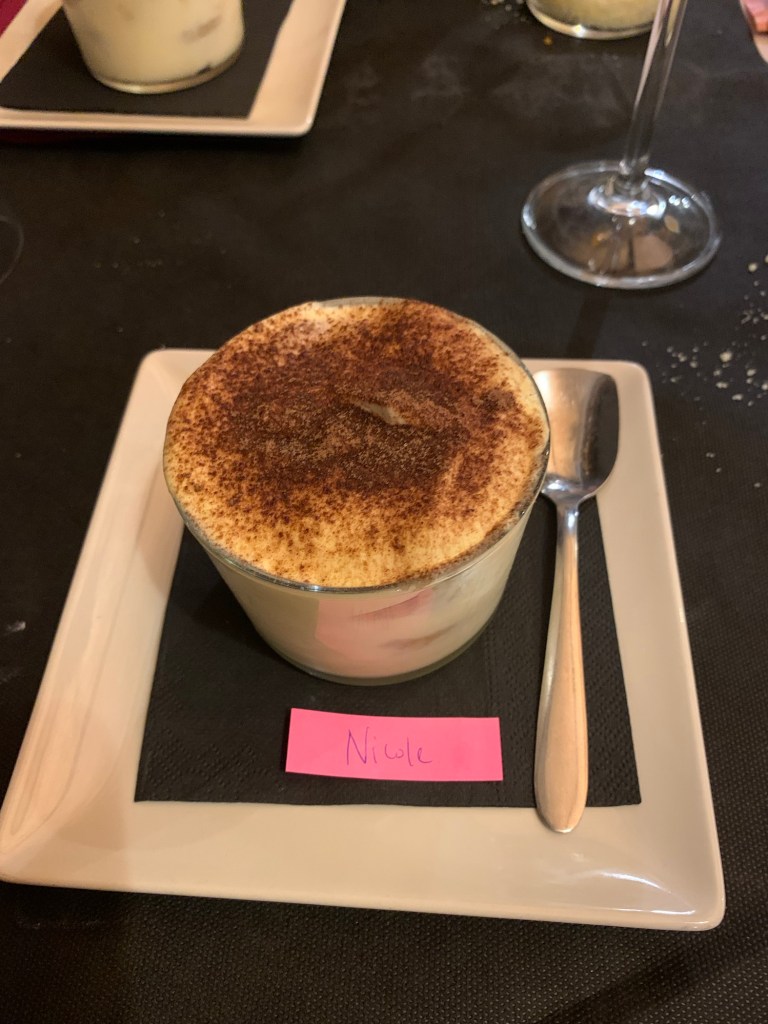Once our dessert was prepped and put in the refrigerator, we moved to pasta making. We made a spinach ricotta ravioli and tagliatelle noodles, served with a tomato sauce. It was delicious!! We enjoyed our individual tiramisu desserts. Yummy!!