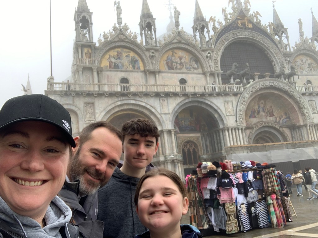 The fog was better than when we arrived last night. We had plans to meet our tour guide, Romy, near San Marco Basilica. We were all shocked when we walked into the square and saw a gorgeous, huge, church – Saint Mark’s Basilica. We couldn’t see it at all the night before. Ty is over looking at the inside of churches so we skipped this one.