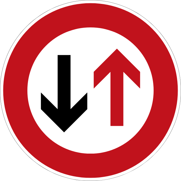 Answer: This sign indicates a narrow passage ahead (so many 1-lane roads everywhere!) and oncoming traffic has the right to cross the narrow place first. Red means stop, so the car on the right has to stop and wait. This one actually kind of makes sense.
