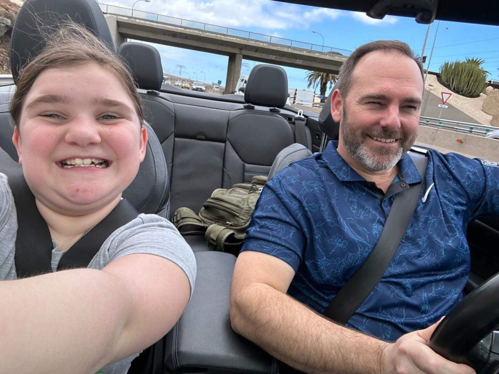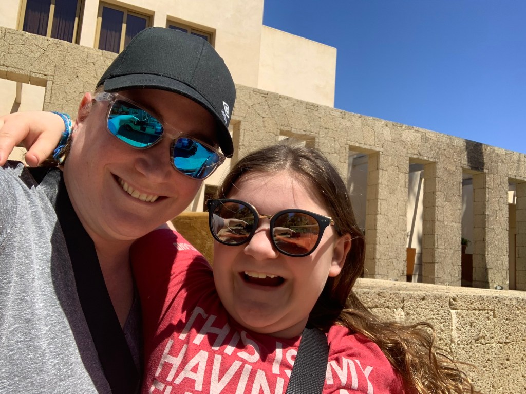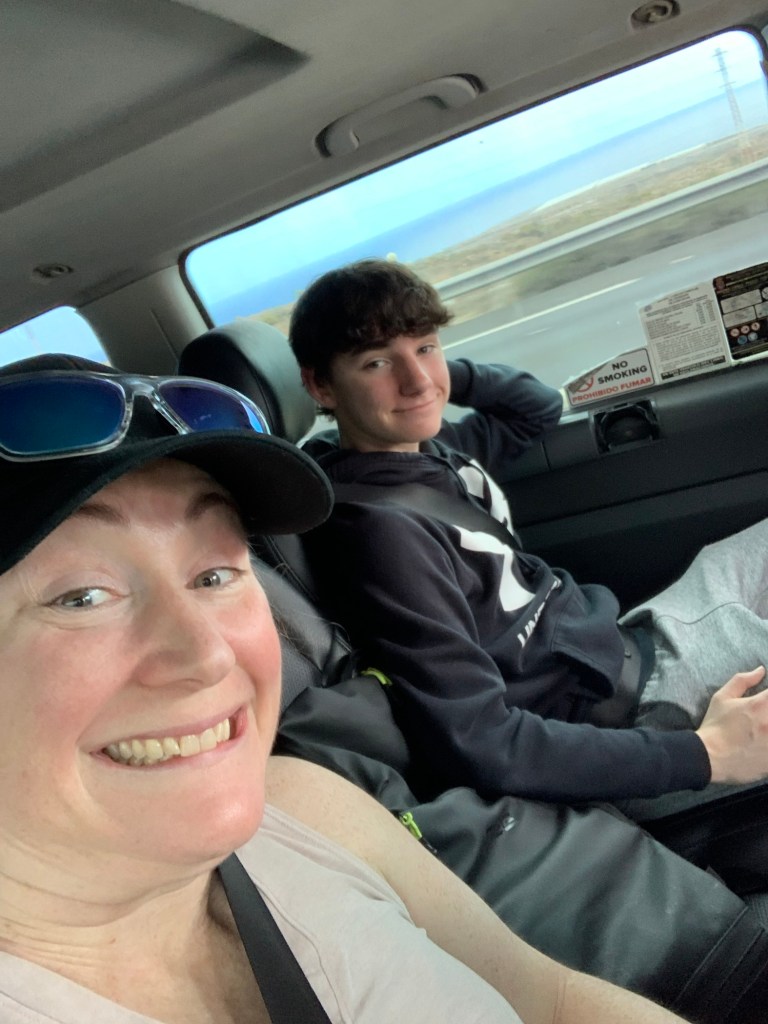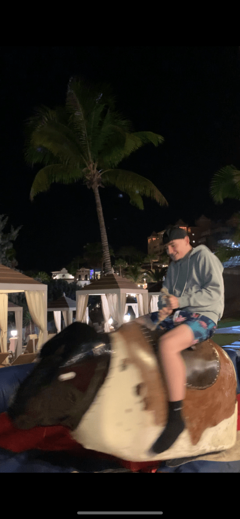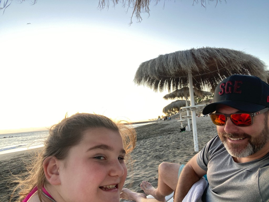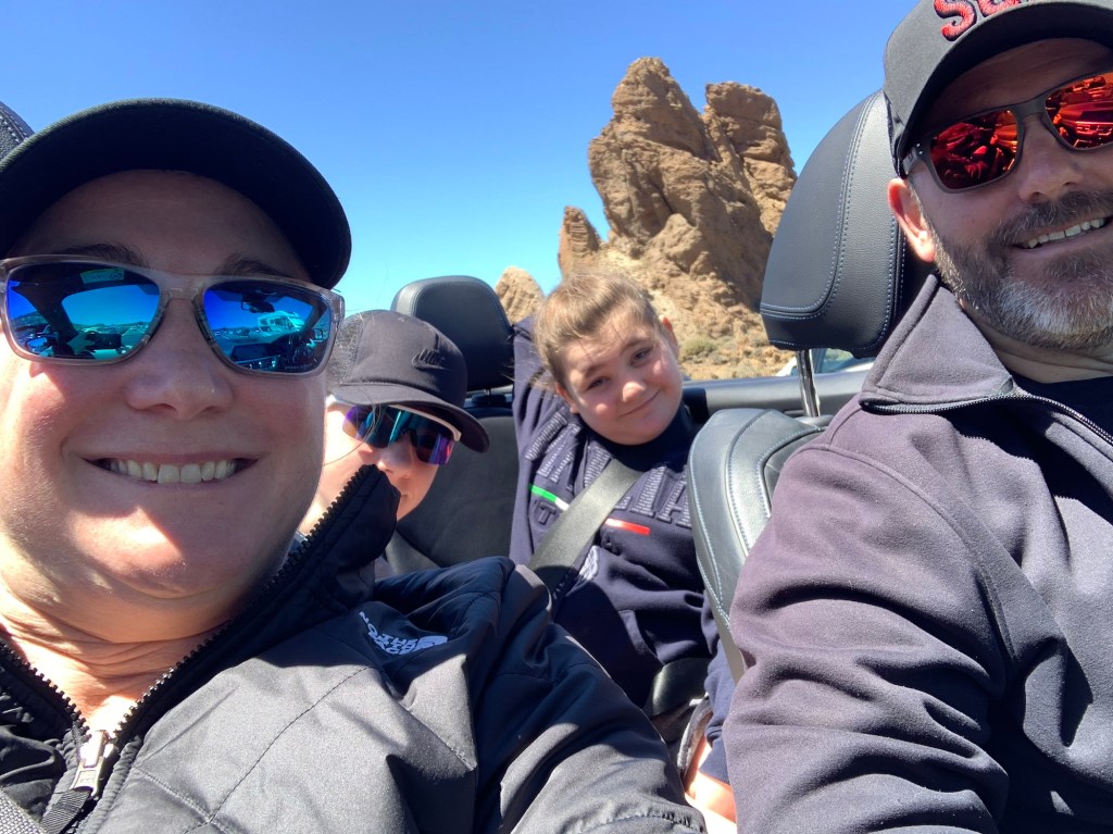 Spa day!“Just five more minutes please????”Yep, she’s a fanLunch at the Beach Club. “Check please!”We walked along the ocean for a bit and sat at the point for a long while, watching the waves come crashing into the lava rock coastline. “That one sounded like a wet fart.”The ATV tour Guide, Ben, took the boys all along the coast and partially up a mountain. It was a mixture of on-road and off-road driving. They had a blast!Dinner Friday night was a barbecue with an Arabic themed show. We sat with a super fun family, lugged a lot, ate a lot, and maybe drank a little too much.Ty tried to ride the mechanical bull. 0.5 seconds. At 44 years old, I should know better than to drink too much wine the night before a mountain drive. Ugh. We had to stop a few times, but it gave us a chance to let the kids run around and explore Teide National Park. We went as high as the road would take us. It was a really cool drive – changing landscape at every turn (and there were a LOT of turns). This was one of the coolest areas. It was a giant “lake” of black lava rocks, as far as you could see. And the clouds were rolling in from below. I love being above the cloudsI spy TyI spy Lily