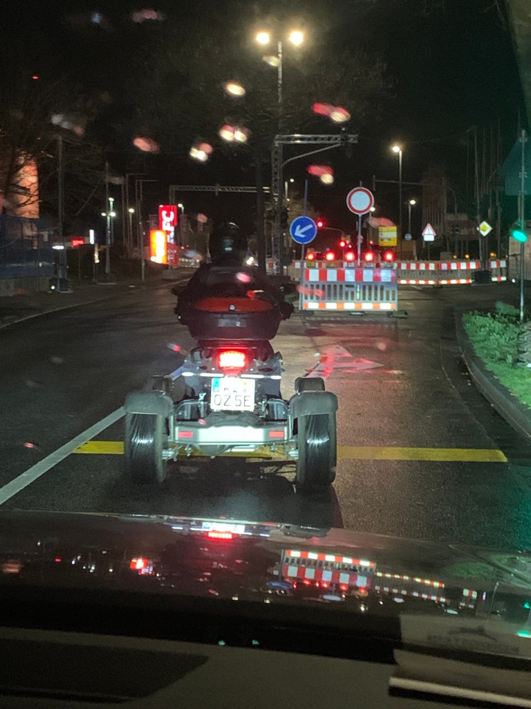 The speed limit CONSTANTLY changes. It goes from 30 KM/HR to 100 KM/HR to 70 KM/HR without (what I have been able to determine so far) any rhyme or reason. Some speed changes make perfect sense, like when approaching an area with exits (Ausfahrts) and entrances. But other times there doesn’t seem to be any change on the road that would warrant a change in speed. And there are speed cameras all over the place, so it is important to keep an eye on the speed or you will get an unwanted letter in the mail. I usually set the adaptive cruise control that does a pretty good job of adjusting to the posted speed, but it isn’t perfect. I also have a little device called the OooNo that alerts me if there are known speed cameras – as long as someone else has flagged the location. So far, no speed tickets for me. Knock on wood.
