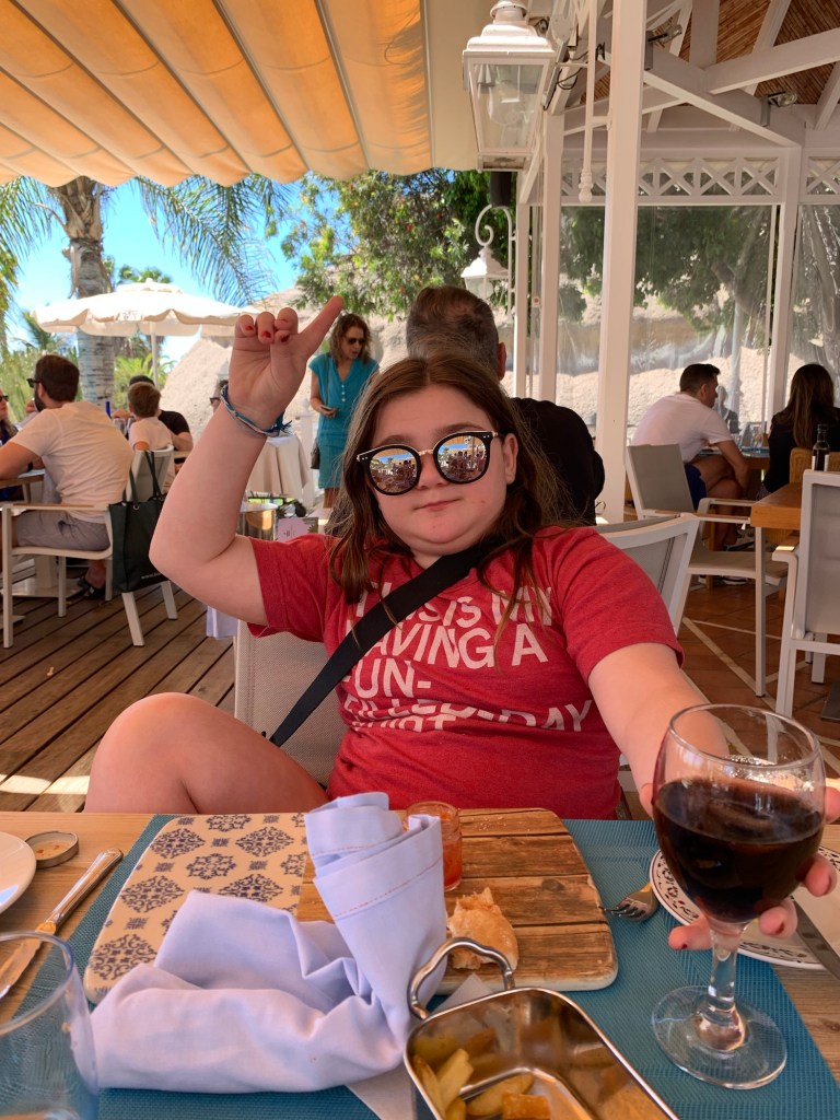 Ty and I and our luggage had to get a taxi to the hotel. Worst taxi driver ever. I nearly puked.Meanwhile Jay and Lily arrived in style in our fun little convertible for the week. We didn’t tell the kids about it in advance, so Lily’s reaction to Jay unlocking the cool car was pure joy. 🙂We are staying at the Bahia Del Duque hotel. Jay found the mini bar. Not a bad view!Lily found the ocean. And lots of topless beach goers. Remember when I told you about Ty’s horrible haircut experience? He hasn’t had a haircut since then, but was long overdue. He decided to cut off most of the back. It looks great. No tears!!!Jay and I ended the first evening with some sangrias. Yummy.