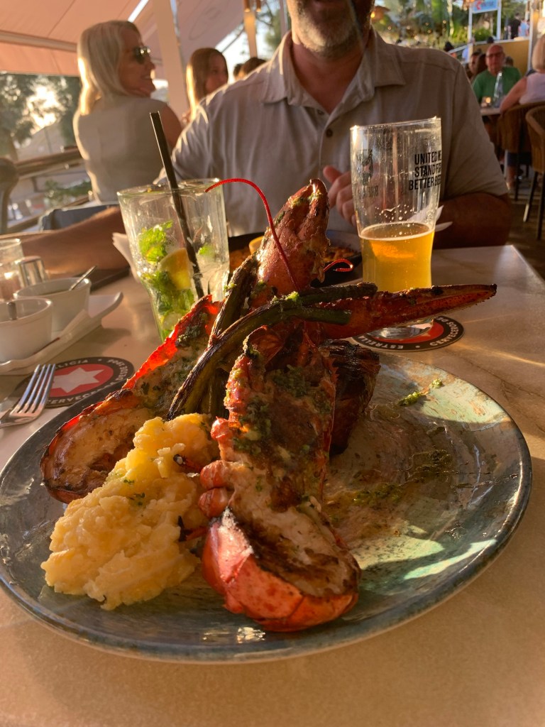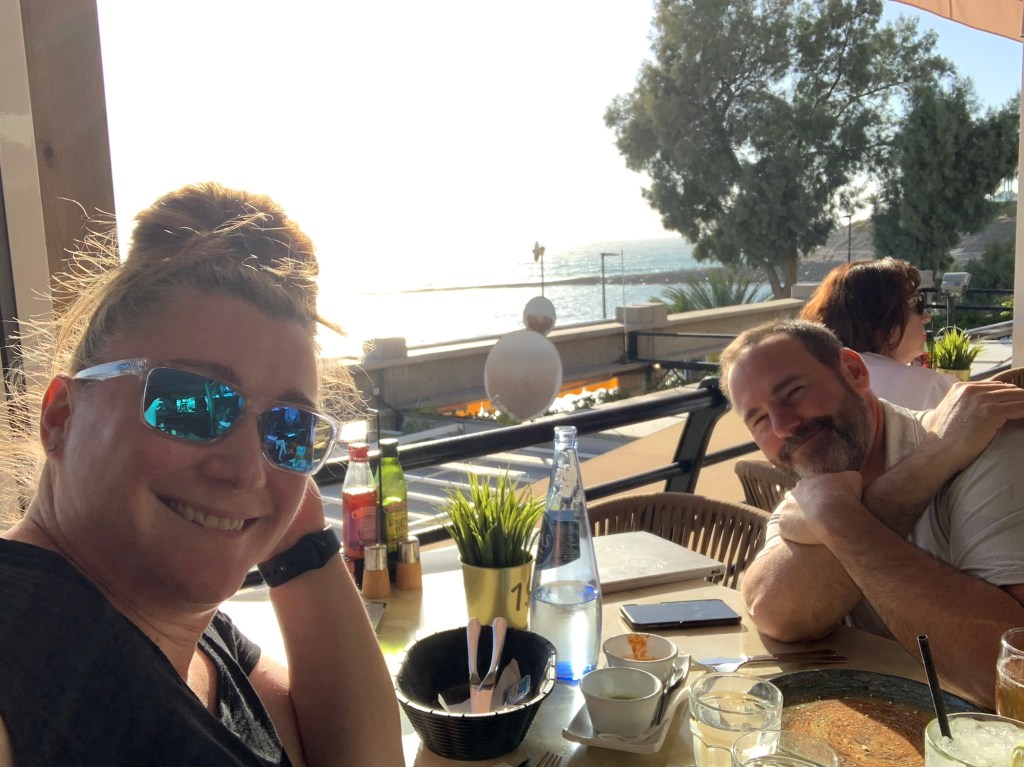 Those are not buildings on the side of the road – they are banana field nets.The kids could choose between go-karts and mini golf. Shockingly they both agreed on mini golf. We went to Vivo Mini Golf and played 36 holes (back 18 was only 1 EUR more, a deal too good for Jay to pass up). While Jay won both rounds, Ty got 2 hole-in-ones, Lily got one, and Jay and I got zero. I think the kids won. Ty didn’t put on sunscreen this morning (I told him approximately 74 times to do it), so after golf he needed aloe. He and Lily ordered room service while Jay and I went out to find a good meal. We were drawn to a place called The Moon that had a great menu and open tables with direct views of the ocean and sunset. Turns out lobster is a lot of work. So much work that I completely missed the sunset. Whoops. It was delicious. Next time I will skip the “turf” part and only get the “surf” part of the meal.