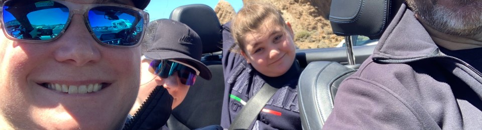 Spa day!“Just five more minutes please????”Yep, she’s a fanLunch at the Beach Club. “Check please!”We walked along the ocean for a bit and sat at the point for a long while, watching the waves come crashing into the lava rock coastline. “That one sounded like a wet fart.”The ATV tour Guide, Ben, took the boys all along the coast and partially up a mountain. It was a mixture of on-road and off-road driving. They had a blast!Dinner Friday night was a barbecue with an Arabic themed show. We sat with a super fun family, lugged a lot, ate a lot, and maybe drank a little too much.Ty tried to ride the mechanical bull. 0.5 seconds. At 44 years old, I should know better than to drink too much wine the night before a mountain drive. Ugh. We had to stop a few times, but it gave us a chance to let the kids run around and explore Teide National Park. We went as high as the road would take us. It was a really cool drive – changing landscape at every turn (and there were a LOT of turns). This was one of the coolest areas. It was a giant “lake” of black lava rocks, as far as you could see. And the clouds were rolling in from below. I love being above the cloudsI spy TyI spy Lily