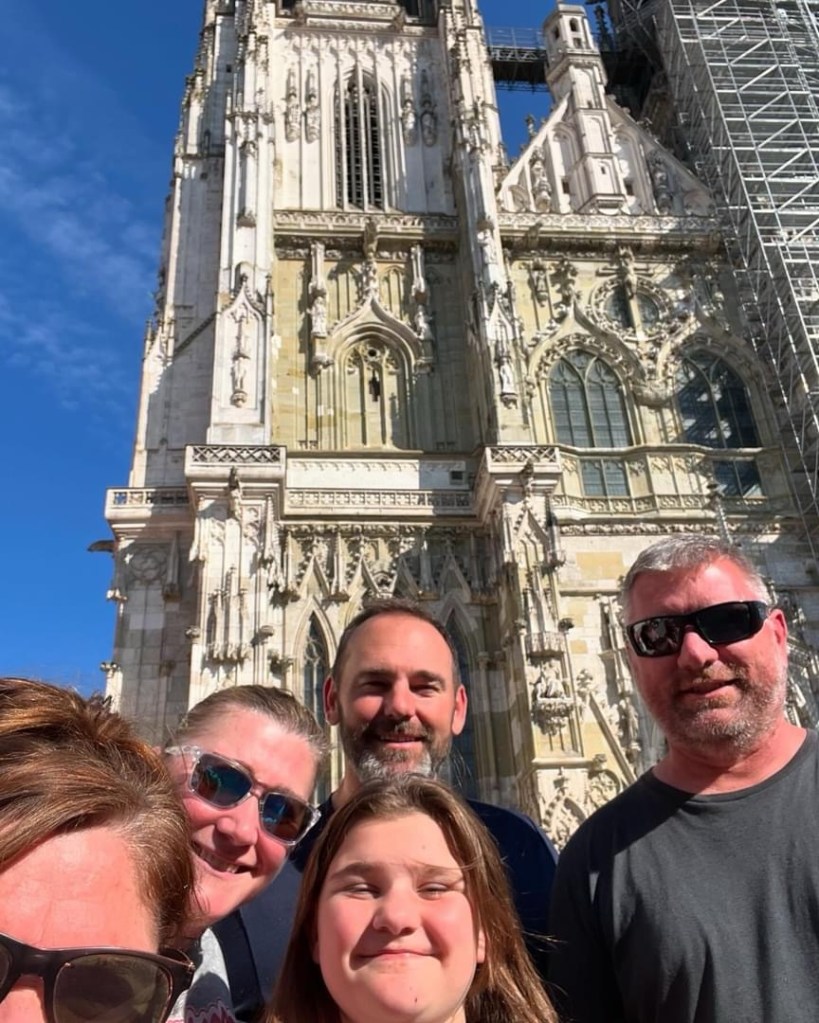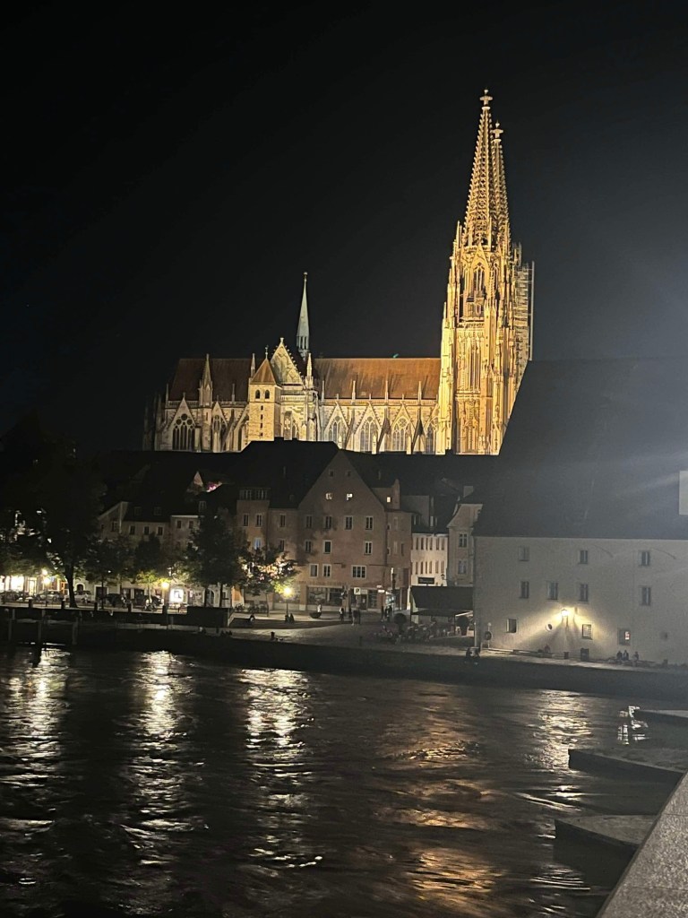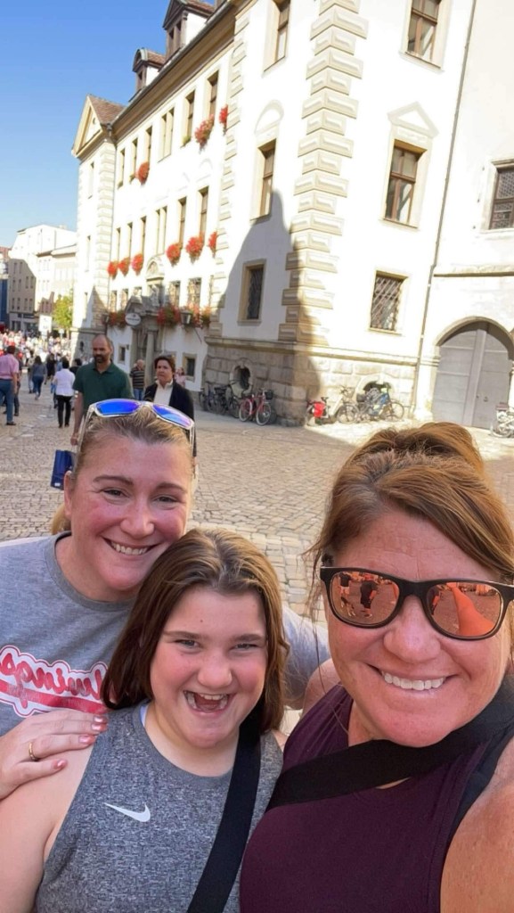 The old stone bridge across the Danube River in Regensburg was built in the 12th century.Day 2 of ball games. Why not start with a beer at 10:00? 🙂A loss on Saturday morning meant we had the rest of the day to explore. Jess and Jason went shopping for Oktoberfest attire (stay tuned), then we wandered around the Altstadt (old town).“Aunt Jekka, this church is just like all of the other churches we have been in.” -Lily I still think they are beautiful. 🙂Jess snapped a great shot of the cathedralWe stayed at the Hotel Orphee. It was super old, loud, but a great location. King Kaycee made himself right at home.Day 3 of baseball. Lily and Kaycee were just about done….Jess and Jason took the train to Prague for a couple of nights. They will meet up with Jay and Riley, who is arriving TOMORROW in Munich on Tuesday.