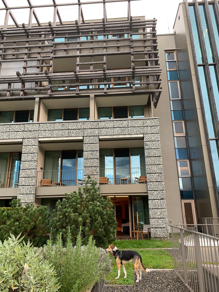 Jay and I arrived on Friday evening. We drove up a windy mountain road in dense fog. We could barely see beyond the front of the car, but we could tell that we had arrived at a very special place. The walk from the parking garage to the elevators to get to the main lobby gave us a pretty good clue about the quality of the hotel. And then the elevator doors opened up to a beautiful reception area, fire burning in a long fireplace. We went to our room to find a dog bed, food and water bowls, a toy, and treats for Kaycee. Our room had a sliding door out to a grassy area, perfect for Kaycee.