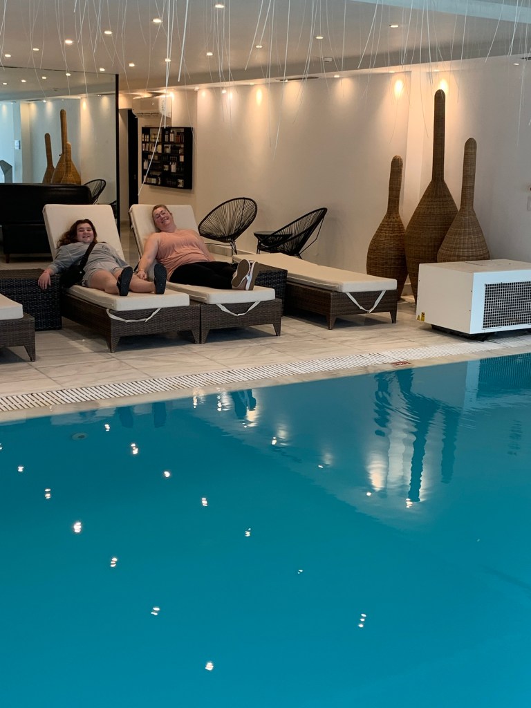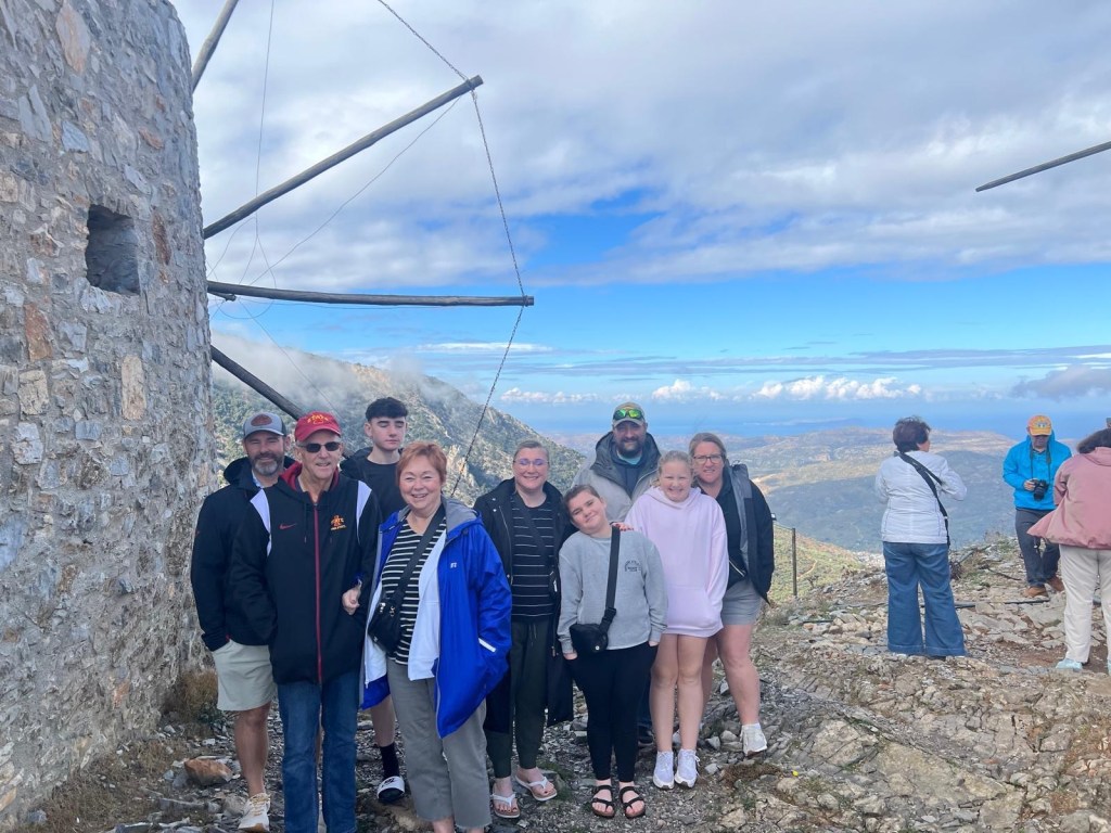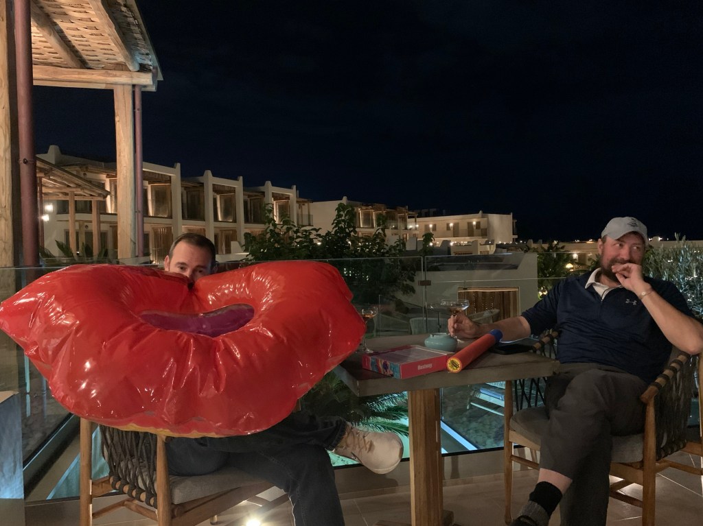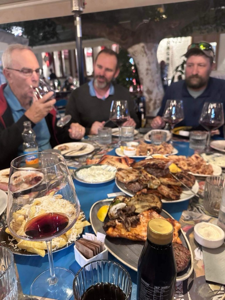 Wheels up!!We arrived after the sunset, but we still found the sea! Trust me when I say it is behind Memaw and I.“Hey dad, I’m going to need you to blow up this floatie….” #dadoftheyearOne of my favorite parts about arriving to our destination after dark is waking up, pushing back the curtains, and looking outside. This view did NOT disappoint!!On Friday morning the girls went to the spa. Lily is going to have to get a really good job when she grows up to afford her massage addiction.The boys went fishing. The water was like glass and the fish were biting like crazy! They probably caught 20 fish each. Some of the fish that they called Sunfish had actual fangs. They also caught some Pufferfish. I wish they had taken a video of those. They had a great day on the water.Deanna and Maggie weren’t going to let the cold water stop them from playing in the waves.Lily wasn’t a big fan of the cold water, but she wasn’t going to let dad’s hard work blowing up the floatie go to waste. She was in her happy place.No way in hell was I going to get in the water. I was perfectly happy staying dry, listening to the waves.Memaw and Papa had the perfect perch to watch our sand volleyball match from their balcony.Friday evening we ventured into downtown Heraklion to experience some local Greek cuisine at Antipodas. We might have ordered just a teensy bit too much food, but it was all SO GOOD!