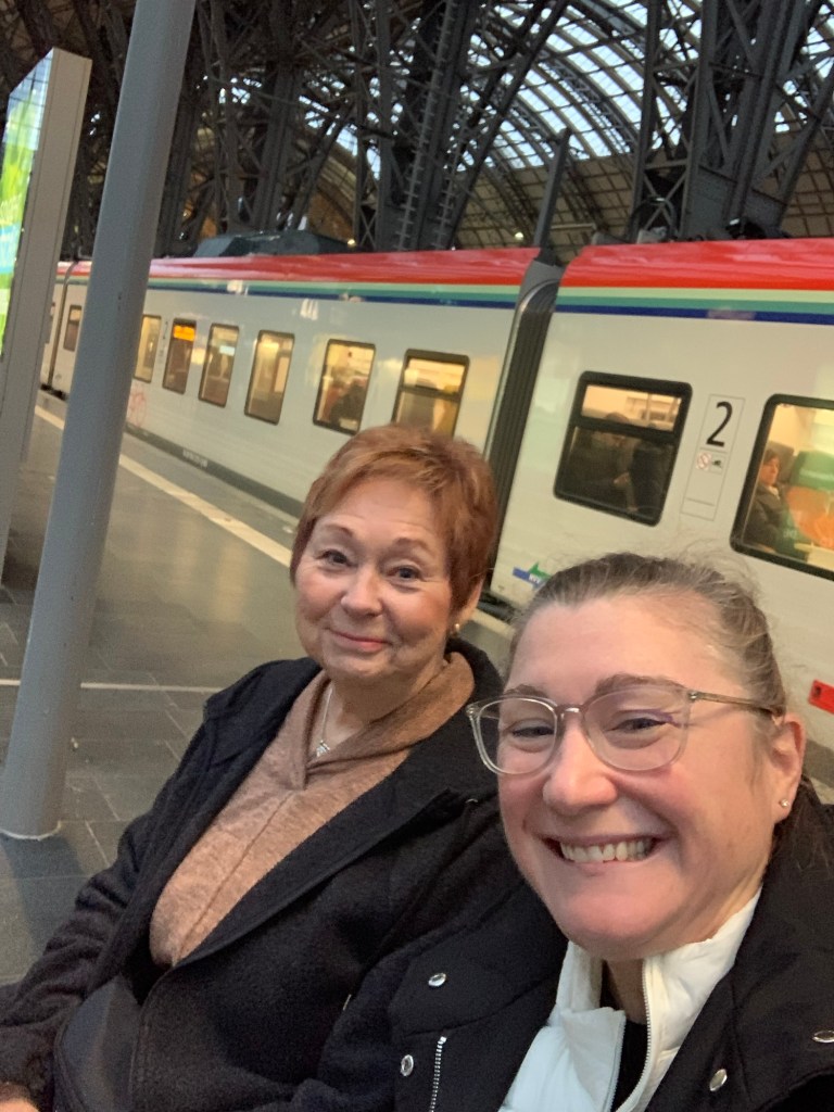 Kaycee is in his happy place. He has missed memaw snuggles.Kirk got a taste of our Sunday hike fun. He walked with Lily and Jay to Rotemüller, where Memaw and I met up with them for dinner. Memaw is a fan of schnitzel. Yum.Hey, Sherry. What do you want to do this weekend? Train to Paris? Ok, sure, sounds good to me. Sherry’s first time on a subway. By the end of the weekend she had it mastered.