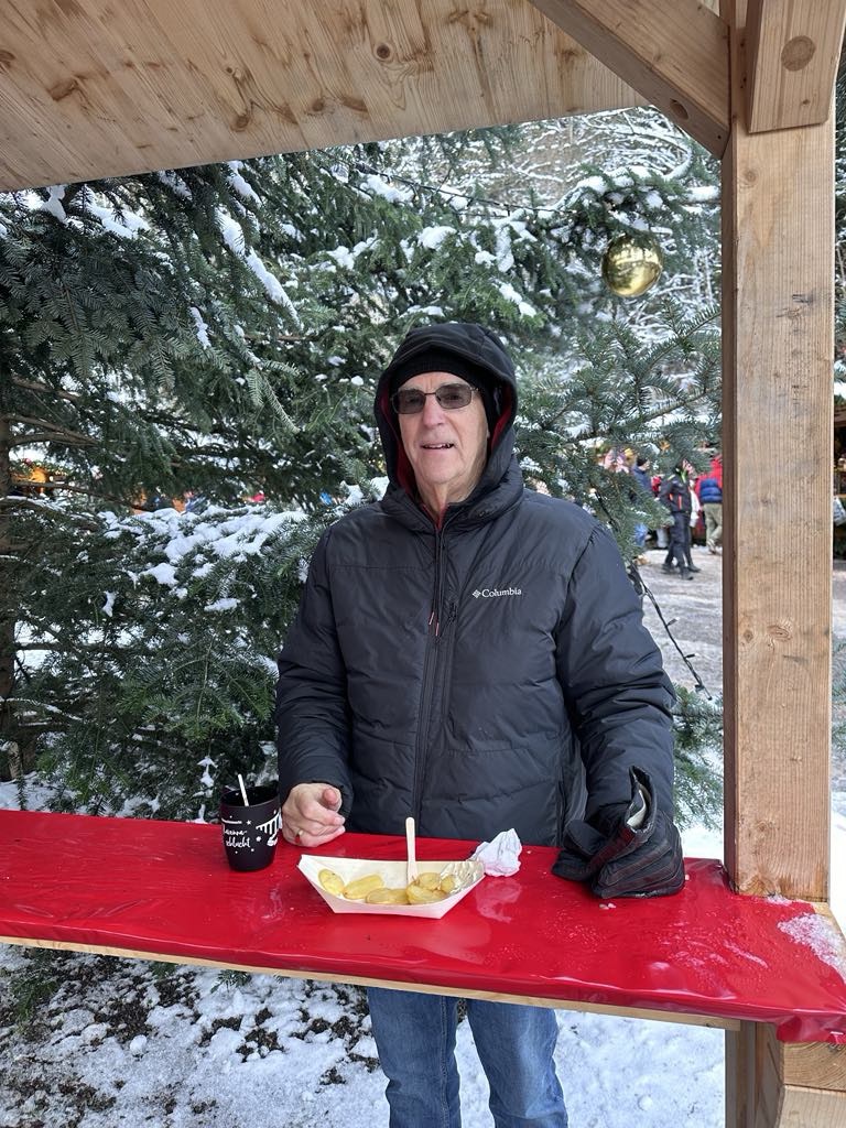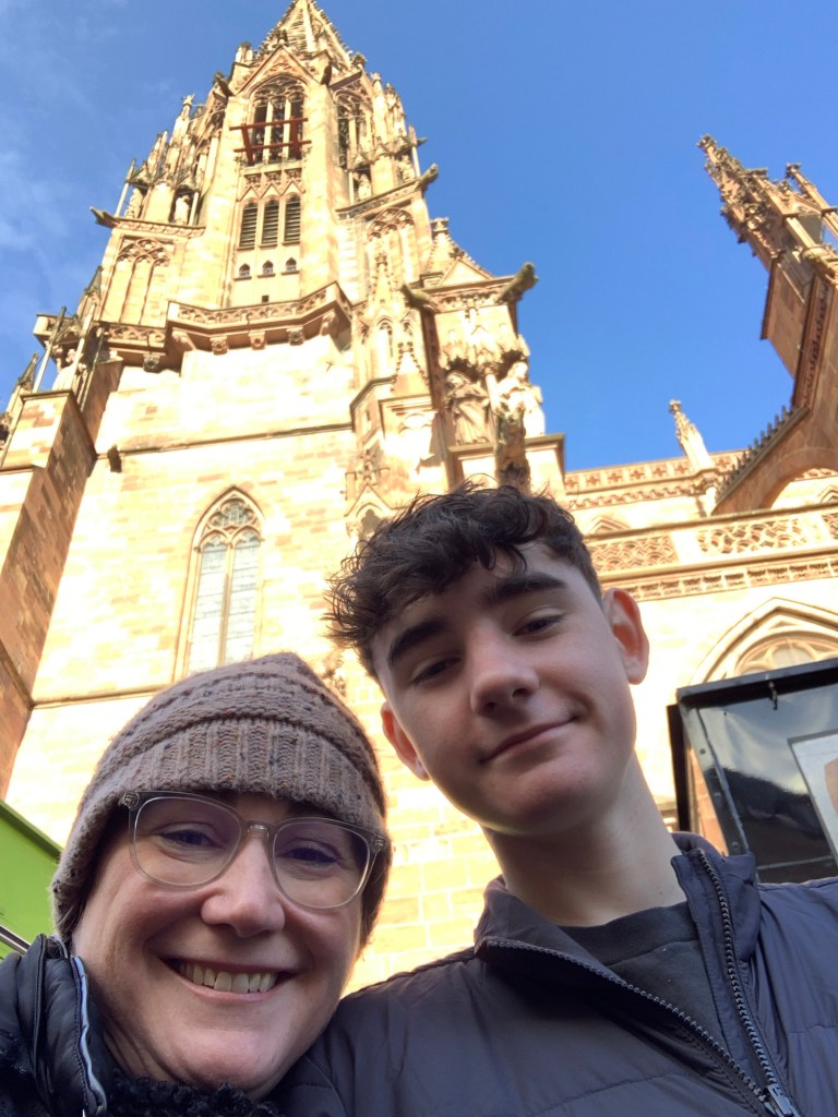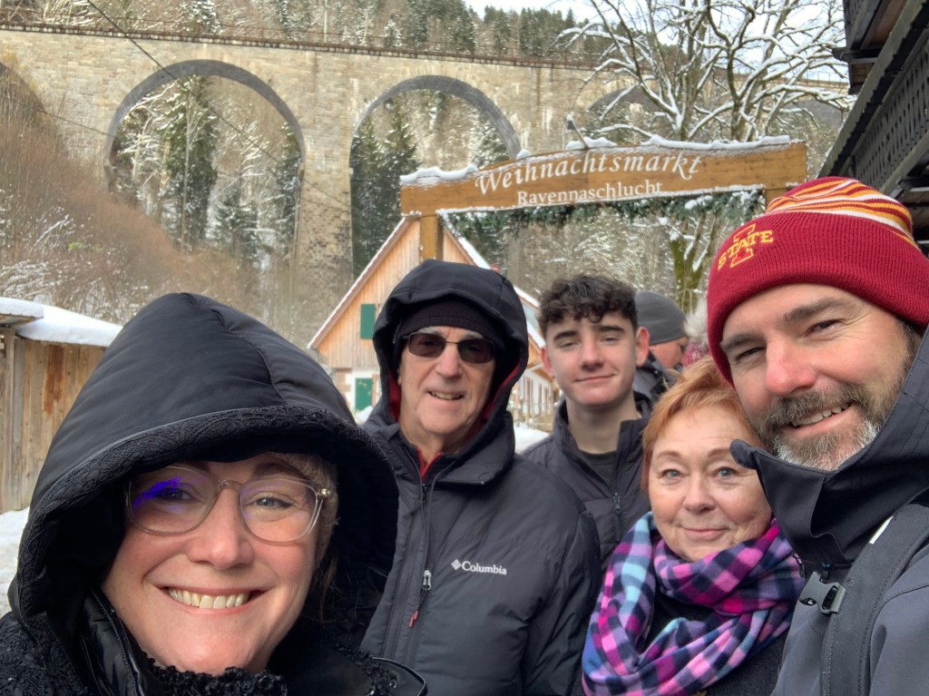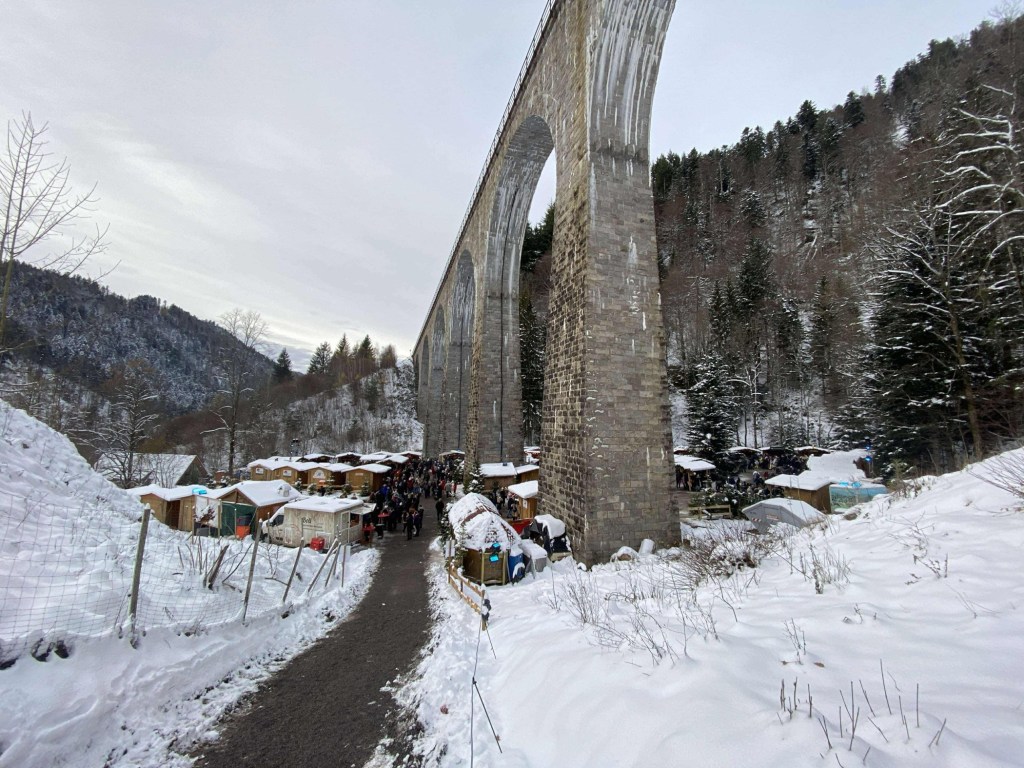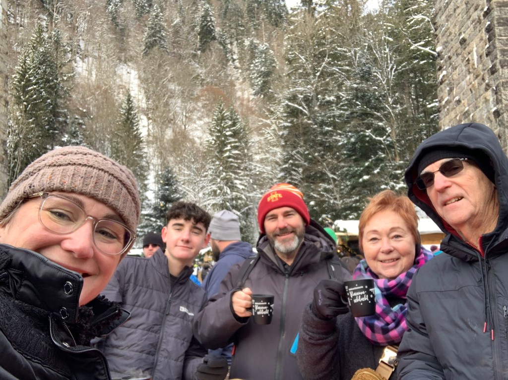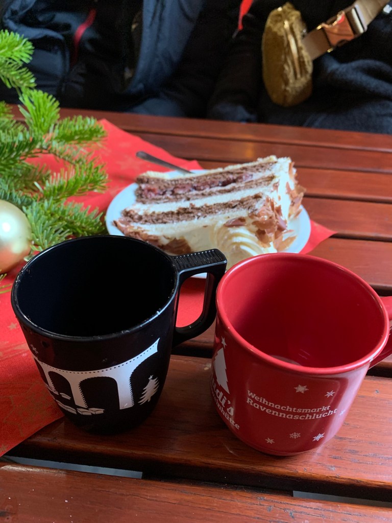 “Hey Ty, will you stand here so I can take your picture?” “Why mom?” “Just do it Ty.” (Giggling) “MOM!!!!!!!”The cathedral in Freiburg was another incredible structure. These Europeans really know how to build a proper church. One that is not only pretty to look at, but can withstand the test of time. The construction on this one began in 1200. How many structures are we building today that will still be around in 800 years?There was a fun market around the cathedral – not a Christmas market, just the normal weekly market. It had a lively atmosphere, several different street performers singing and playing instruments. We had tickets for a 2-hour time slot to visit the Ravenna Gorge Christmas Market, set in a valley underneath a HIGH train trestle bridge. It was a small-ish market, so 2 hours was plenty of time to explore.Plenty of time to drink Glühwein (hot wine).Plenty of time to collect souvenir mugs.Plenty of time to eat lots of yummy food. Yes, I bought some Black Forest ham.