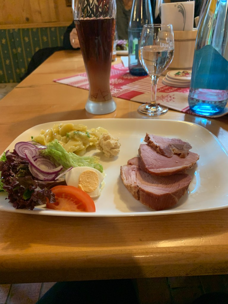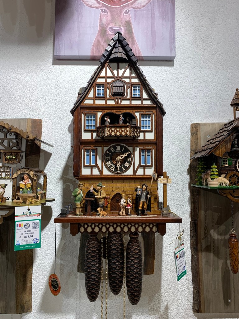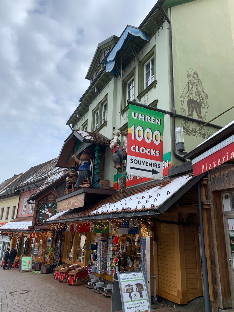 The Black Forest is the birthplace of the cuckoo clock. this cuckoo on the side of the building puts on a show every hour.Sunday morning we drove through Triberg. Such a cool little town! Lots of shops with things made from the wood in the Black Forest – cuckoo clocks, incense smokers, nutcrackers, and more! There is a beautiful stream that flows down some waterfalls through the town. This shop in Triberg is SO COOL! So. Many. Cuckoo. Clocks.1000 to choose from, so not an easy decision, but I finally landed on this one. The street sign out front says “Frankfurt”. It is being shipped to our home in Bettendorf to await our arrival next year.My Auntie Shell had a collection of smokers and nutcrackers. This little guy came home with me. We had one final meal in the Black Forest before heading home. Black Forest ham for me, please!