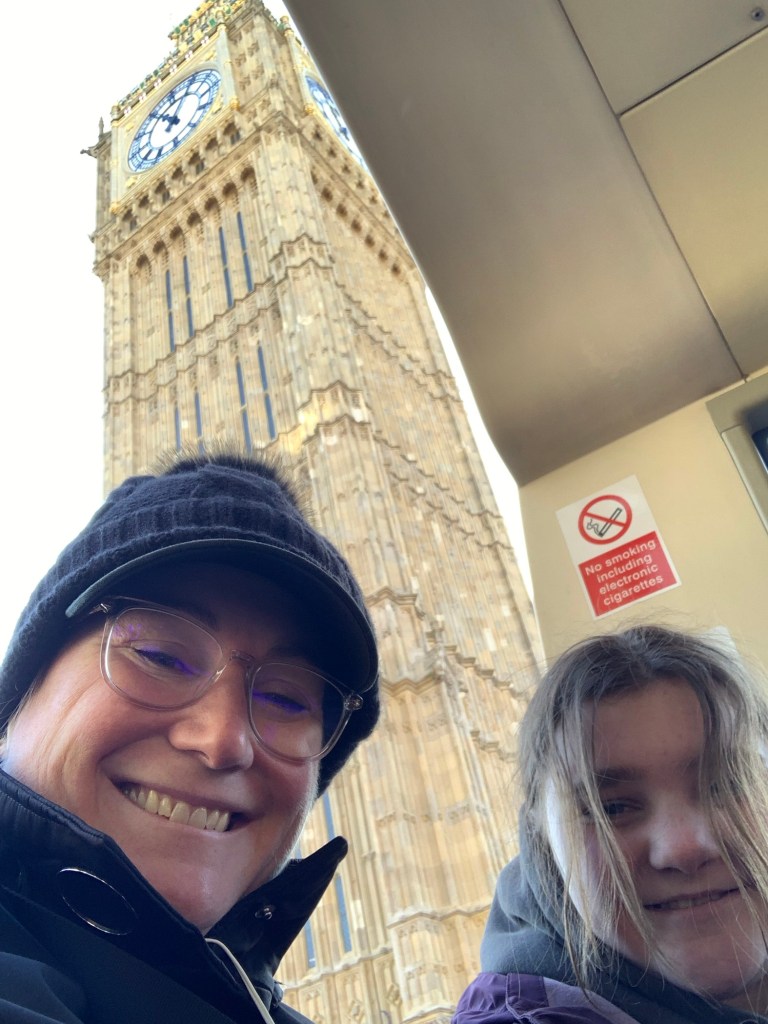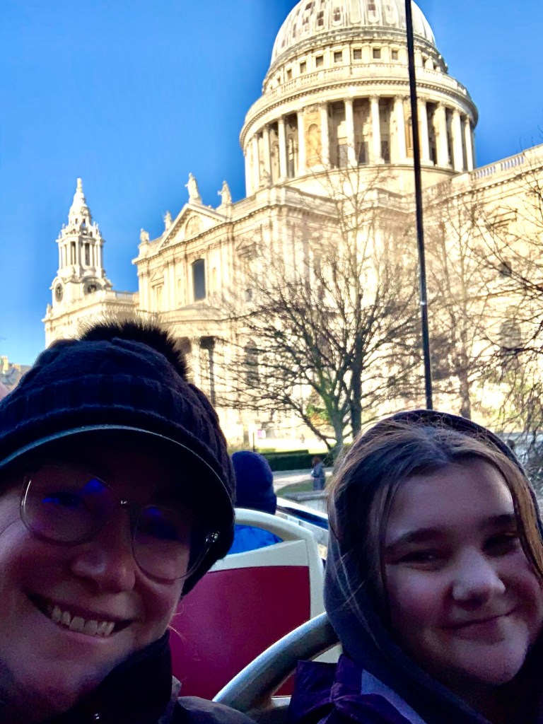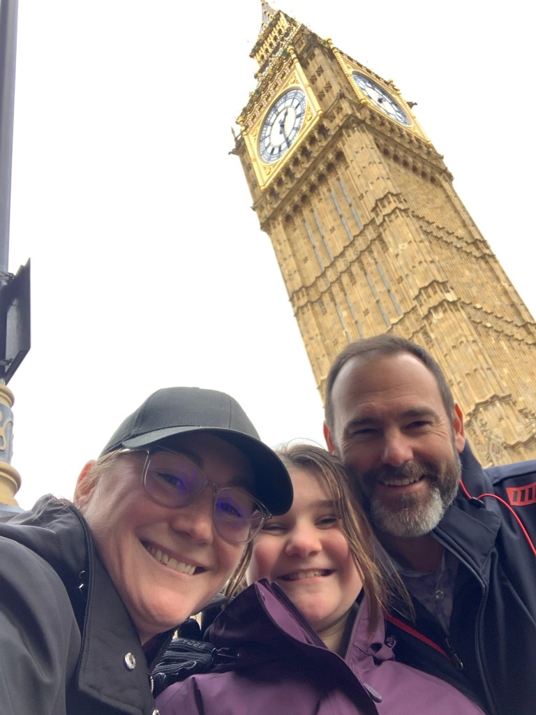 Look kids! Big BenOh hey. There’s Buckingham Palace.So prettyI think we probably need a red telephone booth at our house.We mastered the Underground. Mind the gap!A highlight – Hamilton!! The Brits were good sports about the King. :). He’s my favorite. ya da da da da dah….you’ll be backSuch a beautiful theaterIntermission – all smiles!A chilly Sunday morning loop on the Hop On Hop Off Big Bus.St Paul’s Cathedral The Crown Jewels are in that fortress. Would have been neat to go inside and see them – next time!Look kids! Big Ben!