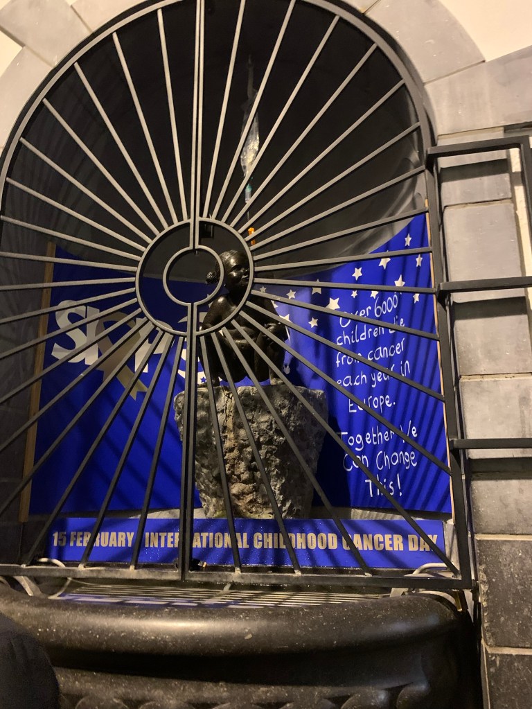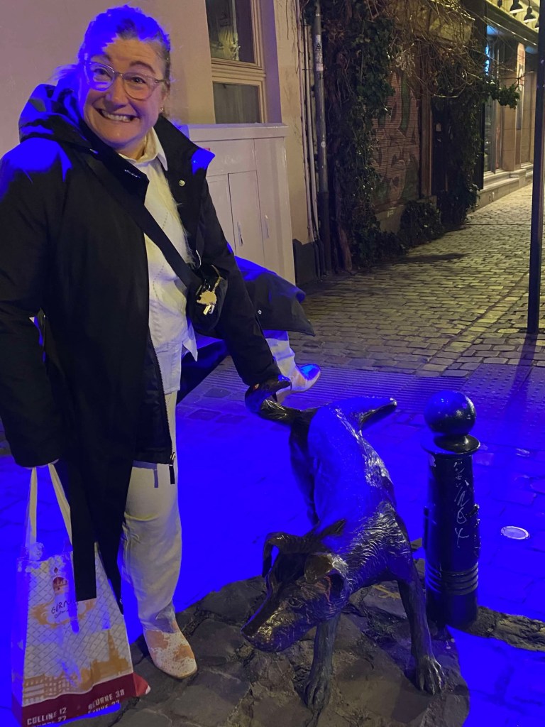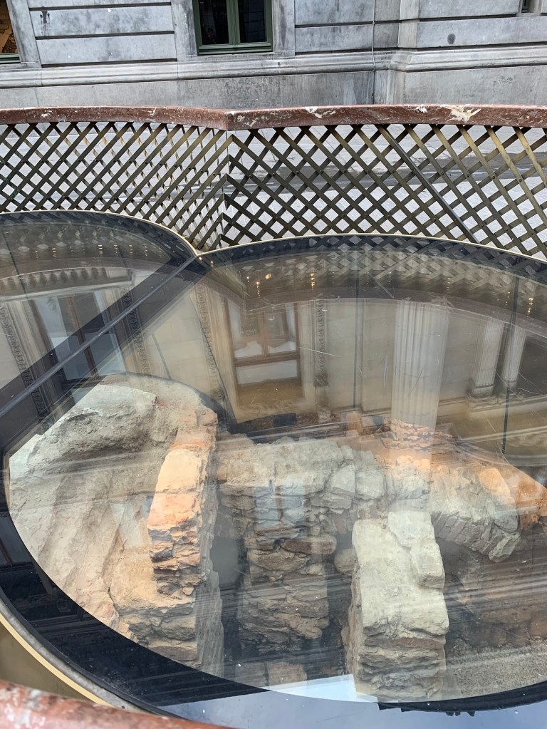 The most famous is the peeing boy. My mom had a fountain with this statue when I was growing up. Who knew that it was a copy of this?One of the best photobombs everThis is Jeannekin Pis. I find it hilarious that they named this statue after me.A closeup of Jeanne. Apparently they often decorate the statues. Jeanne must have needed an IV.This is Het Zinneke, the peeing dog.While we were too full to actually eat a Belgium waffle, this is an example of what I mean when I say there are peeing statue items for sale everywhere.We had a little time Saturday morning to wander around in the daylight. The building behind us is the Belgian Beer World Experience. We didn’t go inside, but the building was beautiful!This was a cool thing. There were a few of these glass-covered holes around the city showing you the ruins below.I mean, this doesn’t look like your typical McDonald’s.