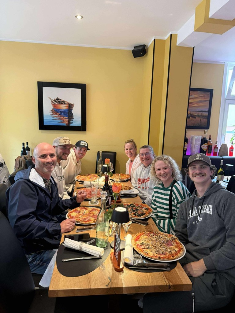 While traveling in a foreign country, you learn a lot about yourself. You adapt to many things that are outside of your comfort zone, but you also realize what things you absolutely cannot live without. For Court, that thing is ice. She MUST have ice in her drinks. Surprisingly most waiters/waitresses gave her what she wanted when she asked for it. We had to stop at a gas station on our way to the holiday home so she could buy a bag. 10 EUR later on e got this tiny little bag, but her drinks were cold!Court loves to paddleboard. Our home had one available, so despite the frigid water temperatures, she took it out for a float. That view…Wine, chocolate, pizza, and Code NamesDid I mention that Court is an adrenaline junky? She wanted to go paragliding, and since Ty wasn’t able to go when Aunt Jekka visited, he was quick to agree to jump with her.Adelle and I dropped them off to make their way up the mountain and we ran into town to find a toilet. Here is Adelle’s recap of her experience.